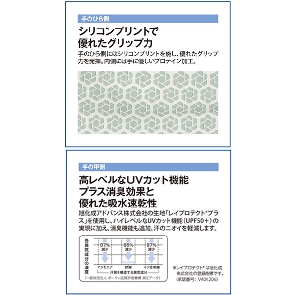 素材:手の甲側=ポリエステル83%+ポリウレタン17% 手のひら側=ナイロン60%+ポリウレタン40%
