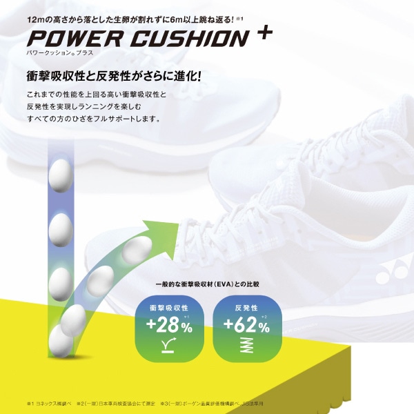ヨネックスが独自に開発した高反発・軽量衝撃吸収材。着地の際のひざへの衝撃を大幅に緩和し、同時に次の一歩をアシスト。