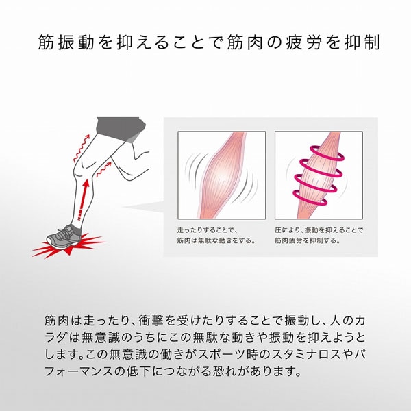 足首からふくらはぎにかけて圧力を段階的に弱める設計で、疲れやすいふくらはぎをサポート。 また、ふくらはぎ全体を圧迫することで、疲労につながる筋肉の無駄な揺れを抑えます。