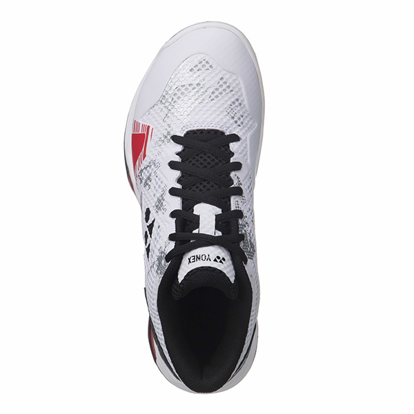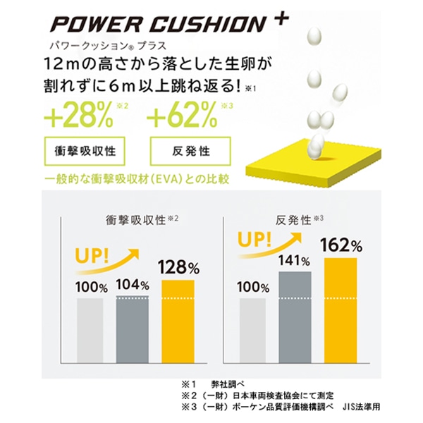 衝撃吸収性と反発性を併せ持つ衝撃吸収反発素材「パワークッション」がさらに進化。素材や形状の研究を重ね、従来の軽量性を維持しながら、衝撃吸収性28%アップ・反発性62%アップ(一般的な衝撃吸収材[EVA]との比較)を実現し、12mの高さから落とした生卵が、割れずに6m以上跳ね返る(ヨネックス社調べ)新衝撃吸収反発素材。