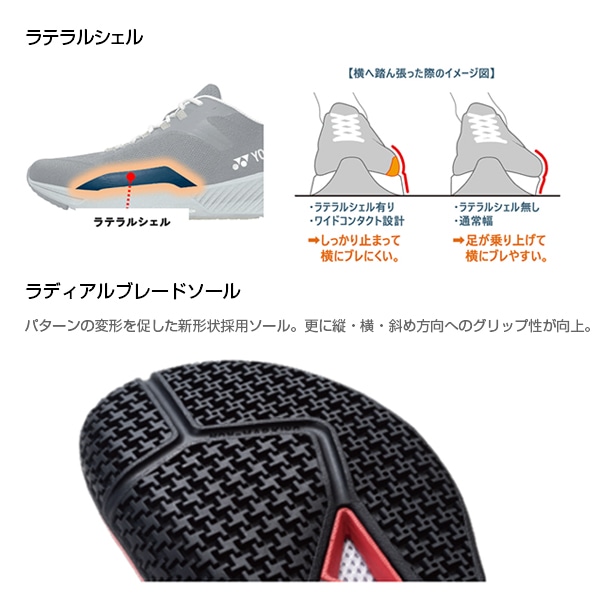 親指の圧迫感を解消したつま先設計とし、かつ、中足部とかかと部のサポート性を高めることで、シューズ内の足のズレを抑え、パワーロスのない素早いフットワークを実現。