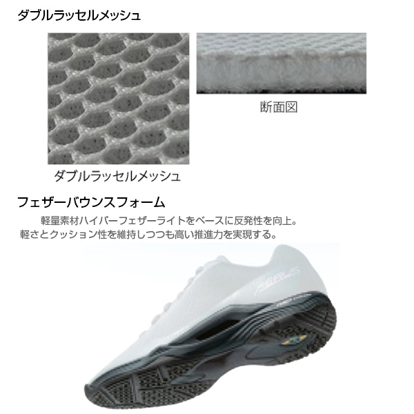 軽量素材ハイパーフェザーライトをベースに反発性を向上。軽さとクッション性を維持しつつも高い推進力を実現する。
