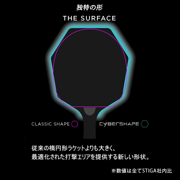 ラケットの中心から先端側にある、より大きな打撃エリア。我々の調査では、大多数のプレイヤーにとって、好ましい打撃エリアはラケットの先端側にある。サイバーシェイプの打撃エリアは、楕円形のラケットと比較して、シェークハンドで約11%、ペンホルダー( 中国式)で約9%大きくなっている。
