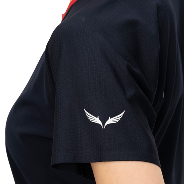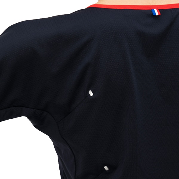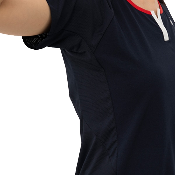 デザイン・機能/テニスの基本動作サーブ・ストローク・ボレーの動きに着目し、動作時のストレスをDISCで検証し、ダーツとパターンで解消した開発した"Aile forme"パターンを搭載したゲームシャツです。