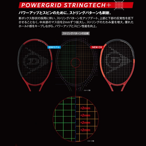 先端部のマス目を拡大し、中央部のマス目はストリングの密度を高めた独自のストリングパターンを採用。これにより最大パワーをキープしながら、先端方向への反発性の向上を図り、スイートエリアも約30%拡大。