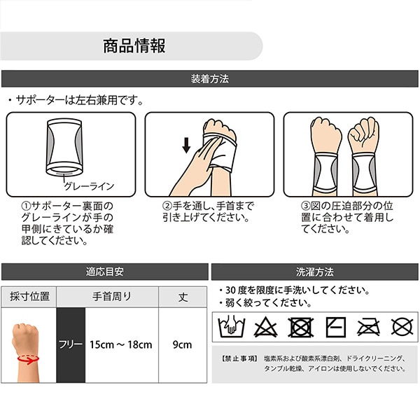 本製品は、手首つけ根と側面を段階的に圧迫し、手関節を「曲げる」「伸ばす」「回す」等の動きをちょっとサポートします。