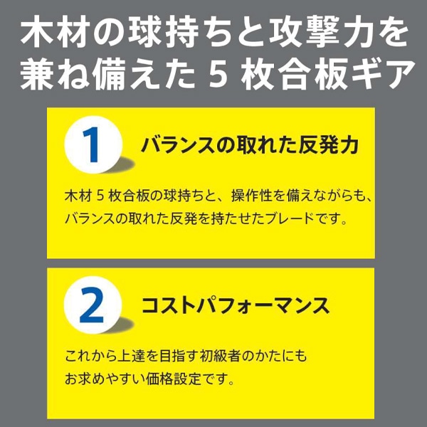 木材5枚合板の球持ちと、操作性を備えながらも、バランスの取れた反発を持たせたブレードです。
