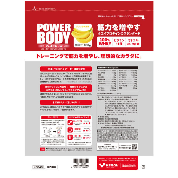 [Kentai オールスポーツサプリメント・ドリンク] パワーボディ 100%ホエイプロテイン バナナラテ風味 830g K0248