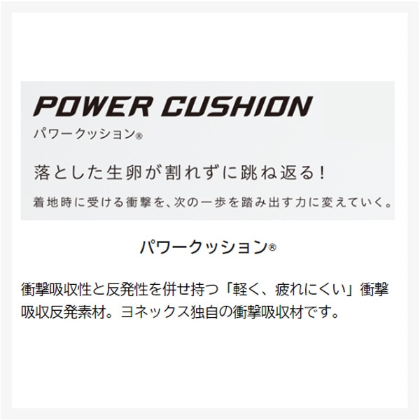 ヨネックス社独自の衝撃吸収反発素材「パワークッション」を搭載し、着時地の衝撃から足を守ります。