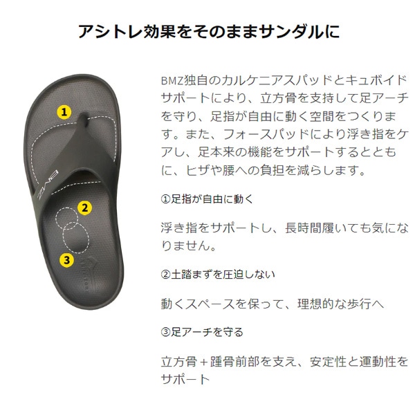 インソール機能を発揮し、長時間履いても負担が少ない、足の健康をサポートするために開発されたBMZならではのサンダルです!