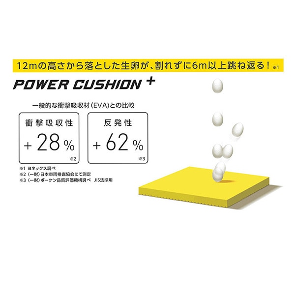12mの高さから落とした生卵が、割れずに6m以上跳ね返る「パワークッション®プラス」ヨネックス独自の衝撃吸収性と反発性を併せ持つ衝撃吸収素材パワークッション®。パワークッション®に反発性の高い特殊樹脂を添加し、格子状に+型の溝を最適な間隔と深さで配置した新構造を採用した「パワークッション®プラス」は、従来の軽量性を保ちつつ、衝撃吸収性を28%※1、反発性を62%※2向上させ(一般的な衝撃吸収材[EVA]との比較)、12mの高さから落とした生卵が、割れずに6m以上跳ね返る※3新衝撃吸収反発素材です。※1 (一財)日本車両検査協会にて測定※2 (一財)ボーケン品質評価機構調べ JIS法準用※3 ヨネックス株調べ