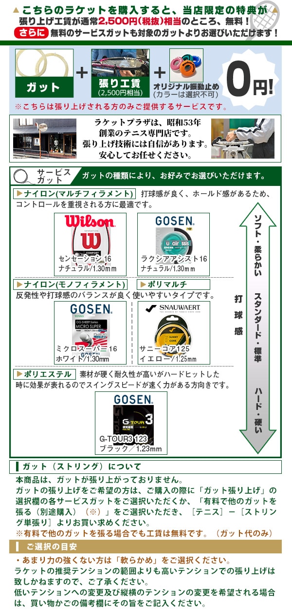 「有料で他ガットを張る」選択の場合はご希望のガットを一緒にご購入してください。