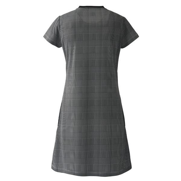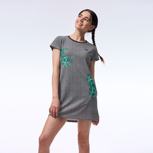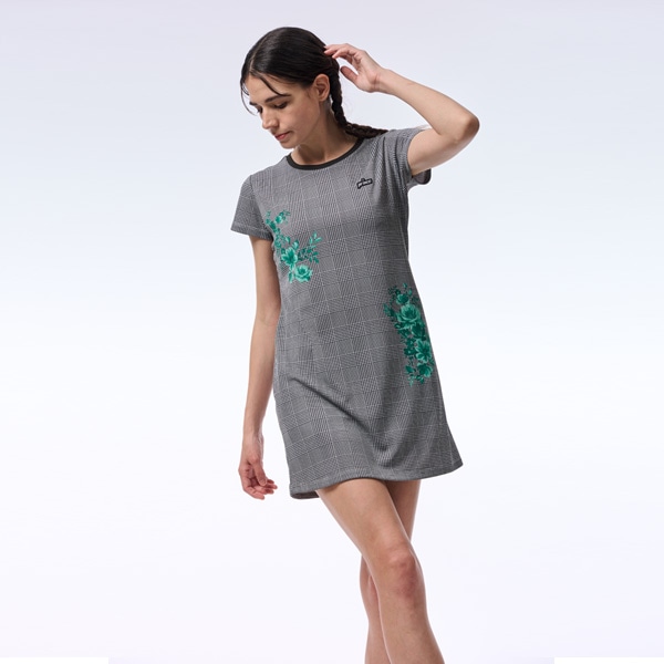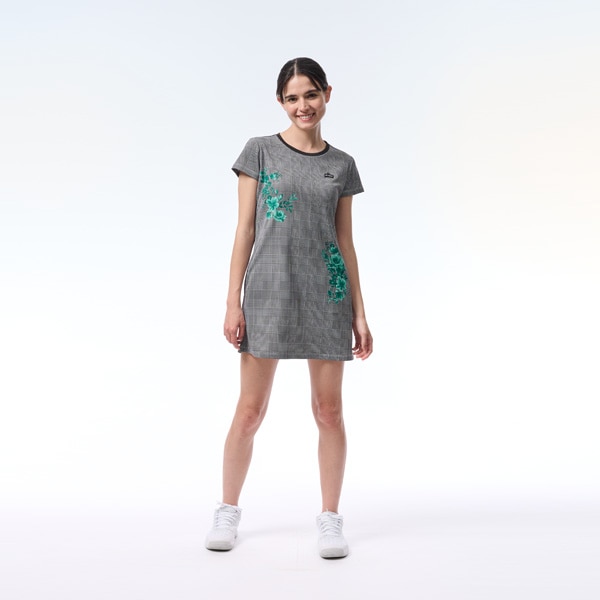 グレンチェックの上にサザンカをイメージした花を大胆にプリントしたワンピース。