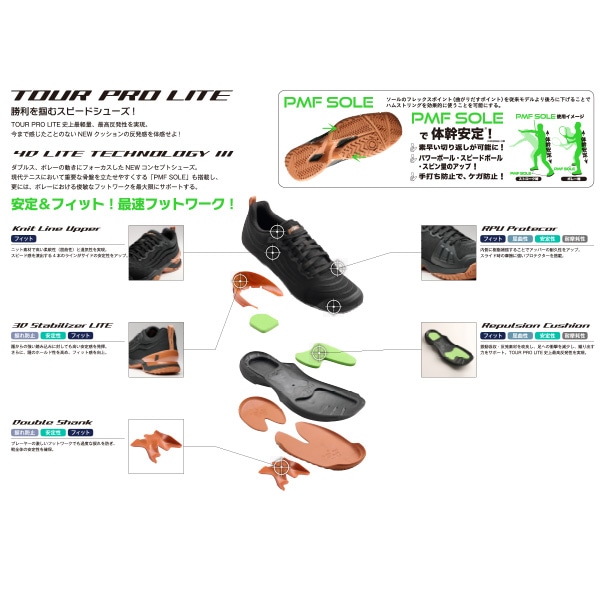 素材:アッパー:RPU(合成樹脂)+合成繊維 アウトソール:耐摩耗ラバー ミッドソール:モールデッドEVA+3DStabilizer LITE+DoubleShank+REPULSIONCUSHION