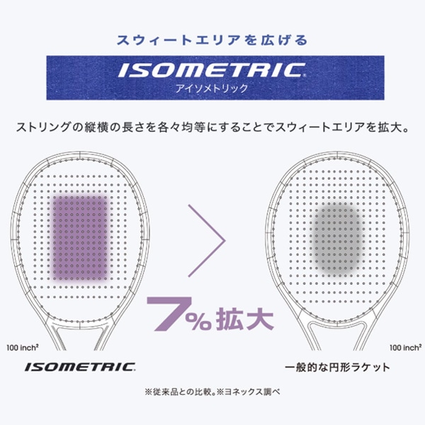 ストリングの縦横の長さを各々均等にすることで反発や振動が安定。一般的な円形ラケットに比べ7%※広いスウィートエリアを実現。※「ISOMETRIC」はヨネックス(株)の登録商標です。※従来品との比較/ヨネックス(株)調べ
