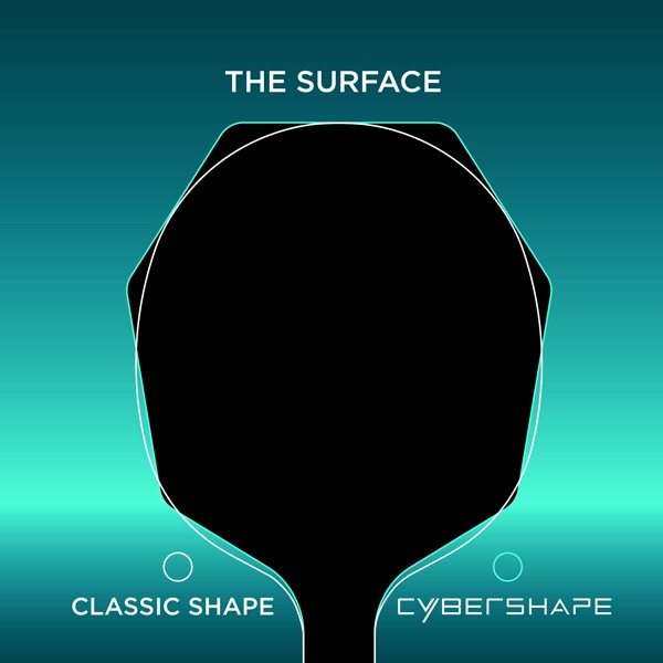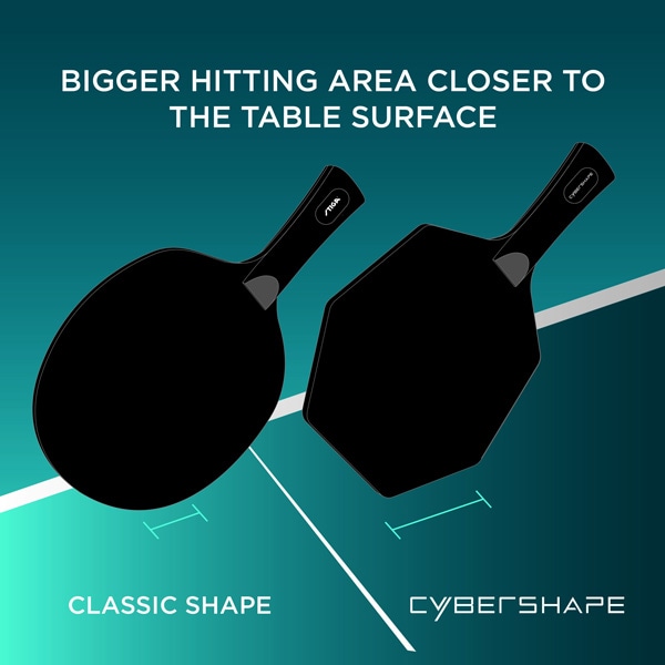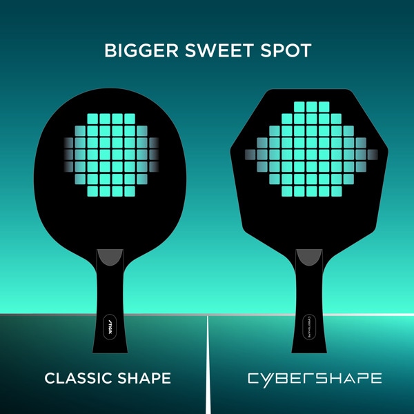 サイバーシェイプの打撃エリアは、楕円形のラケットと比較して、シェークハンドで約11%、ペンホルダー(中国式)で約9%大きくなっている。