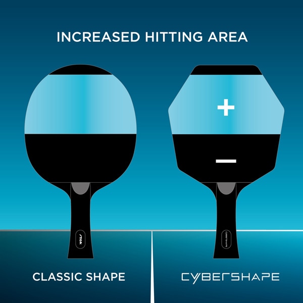 サイバーシェイプの打撃エリアは、楕円形のラケットと比較して、シェークハンドで約11%、ペンホルダー(中国式)で約9%大きくなっている。