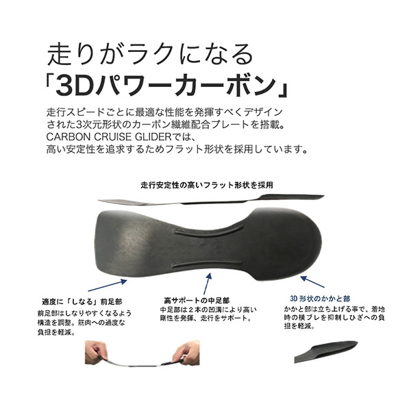 着地時の横ブレを抑えつつ、適度なしなりが筋力の負担を軽減し、前への推進力を生み出す。