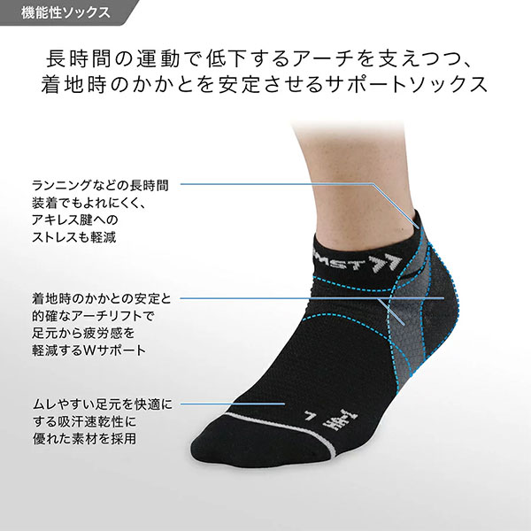 独自の編み方で、かかとのグラつきを抑え、足底アーチへの負担を軽減。長時間の高いパフォーマンス維持をサポートします。