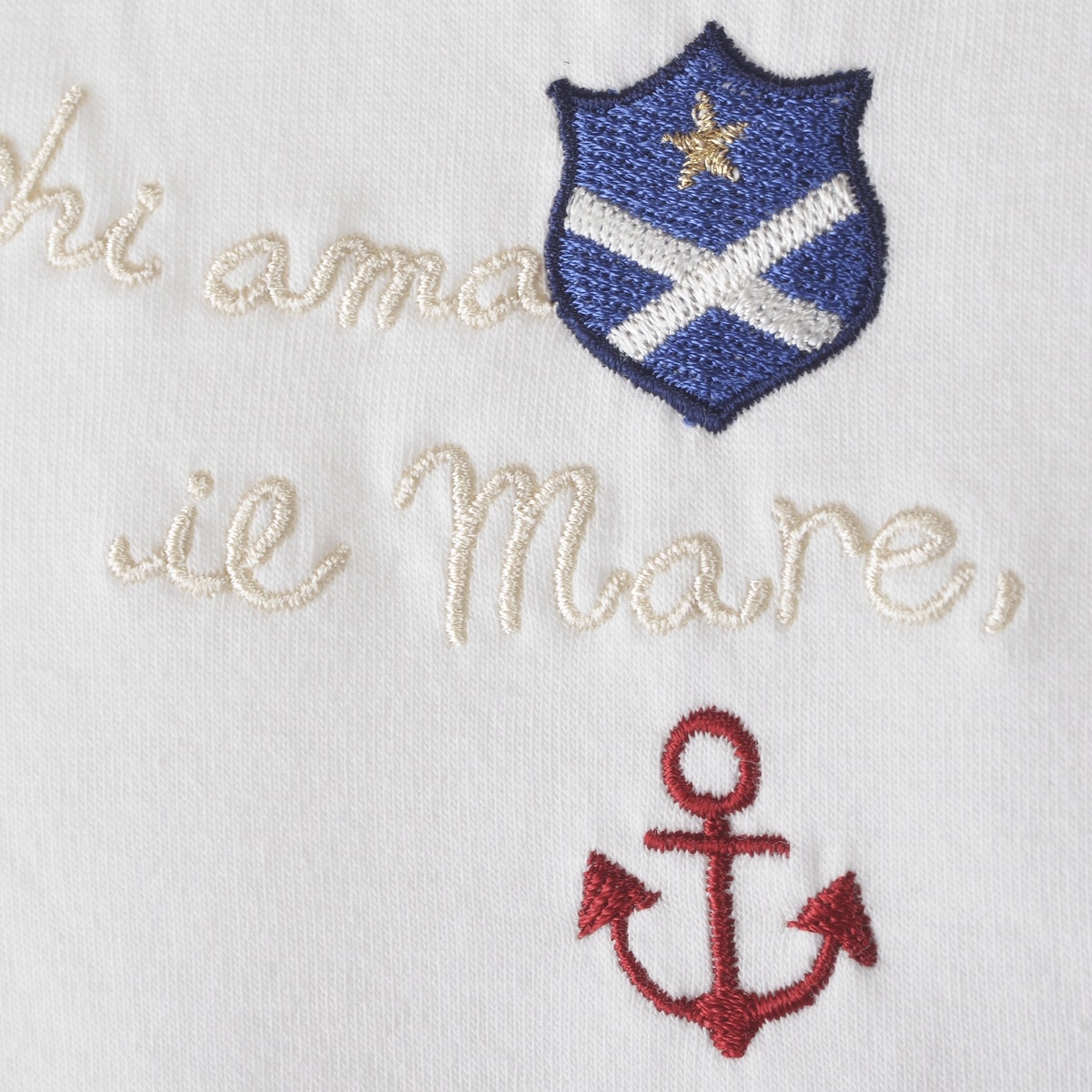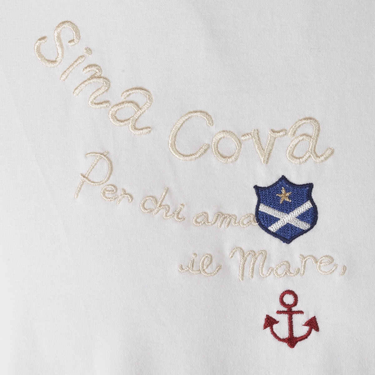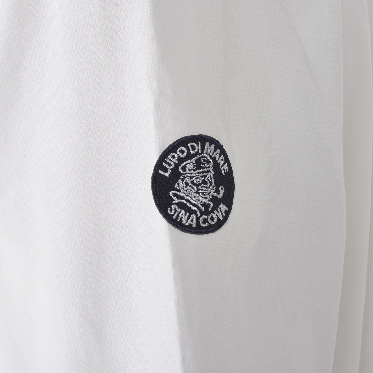 SINACOVA文字、イカリの刺繍やエンブレム調のワッペンをデザインしたモックネック長袖Tシャツです。