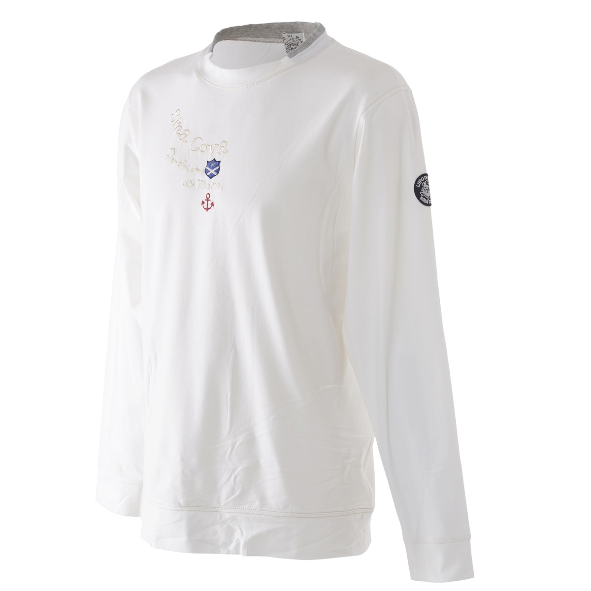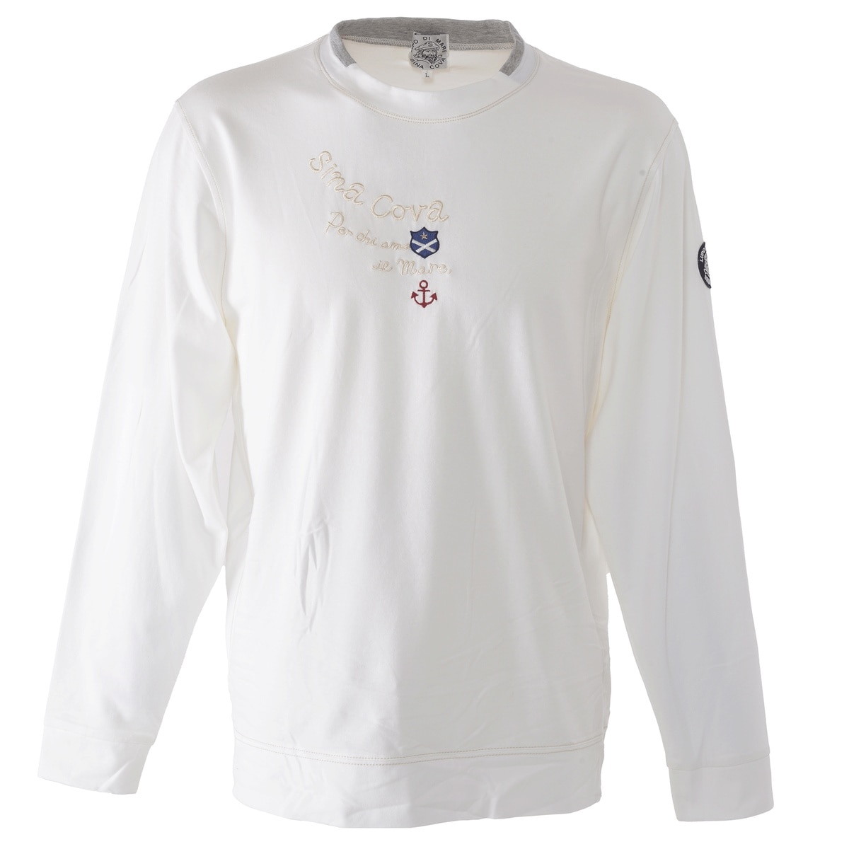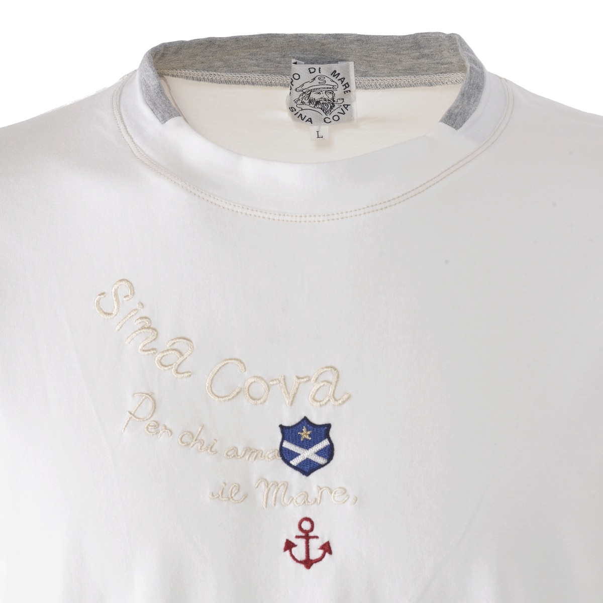 SINACOVA文字、イカリの刺繍やエンブレム調のワッペンをデザインしたモックネック長袖Tシャツです。