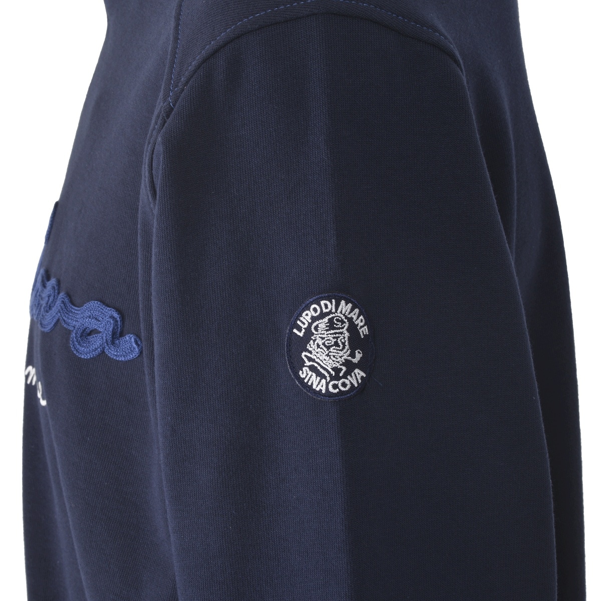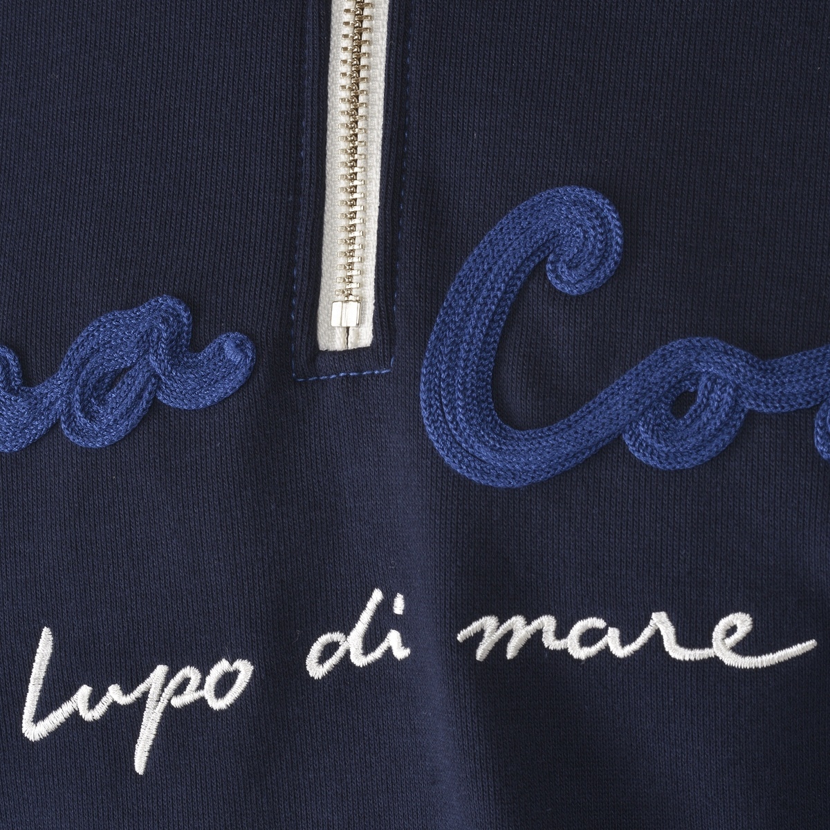 リリアンコード状に刺繍したシナコバロゴと衿元のカラー配色が特徴的なプルオーバーです。度詰裏毛の中肉タイプで毛羽立ちが少なくソフトで発色性の良い糸を使用したオリジナル素材を使用しています。また、編み方もひと工夫しており、きれいな生地を使用したフロントには、シナコバの刺繍を同系色で施しています。