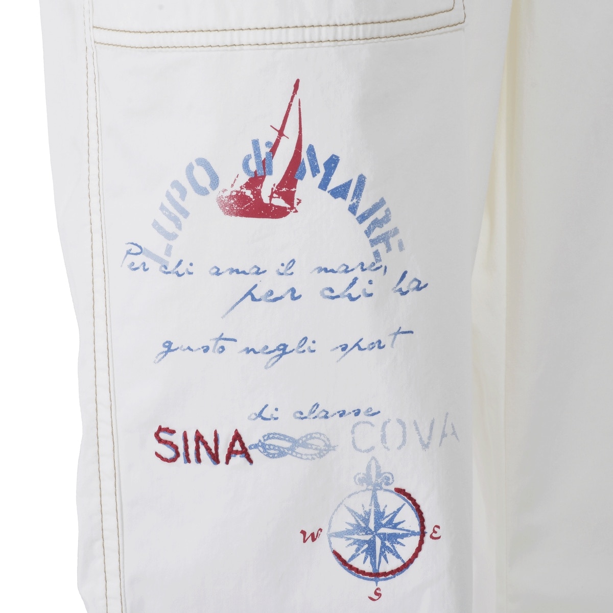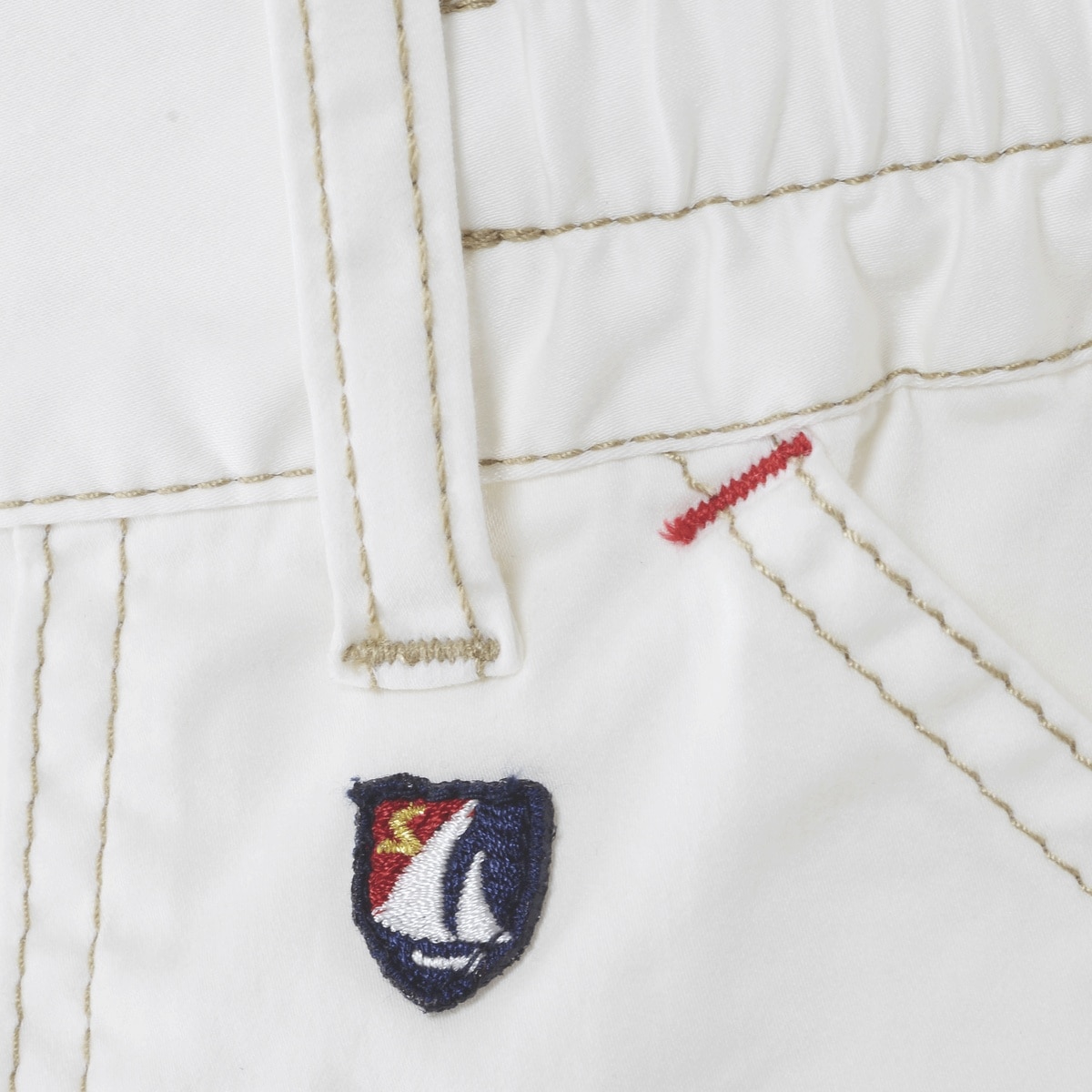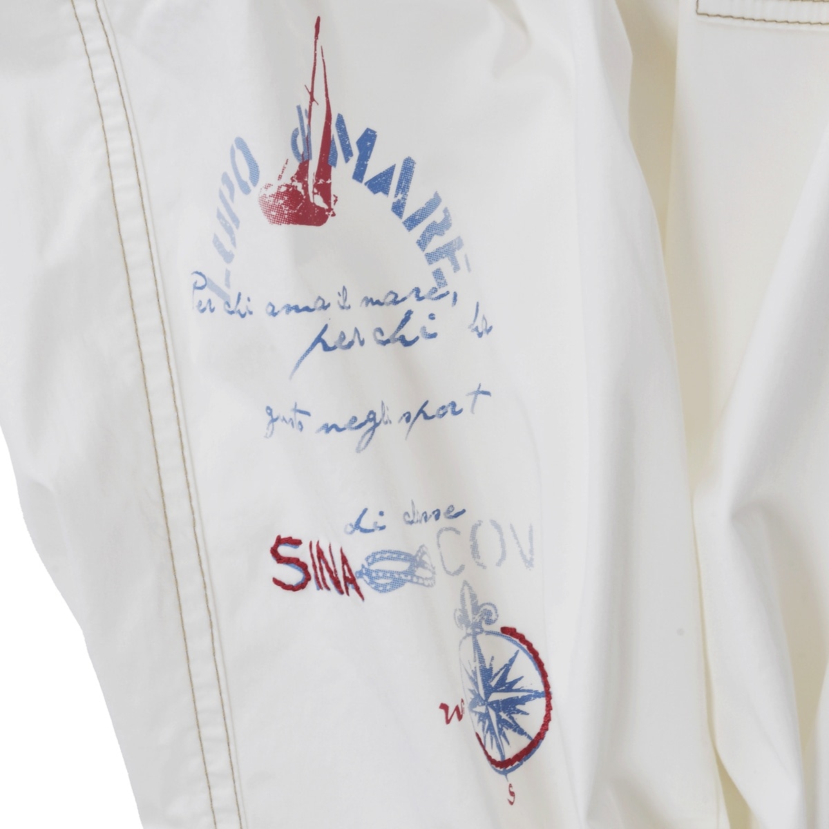 サテン組織によるなめらかな光沢と、ストレッチ性のある柔らかで伸びのあるストレートシルエットのマリンパンツです。右フロント部にシナコバならではの大胆なプリントや刺繍を施していて、ワンポイントアクセントとして楽しめます。またフロントポケット下部には鳩目を配置することで、マリン感を演出しています。その他、タックボタンやバックポケットのボタンにもこだわっていて、船舶の舷光をボタンの色で表現しています。ウエストゴム仕様かつウエスト紐で腰回りのサイズ調整も容易な為、お好みの着丈で着用いただけます。・ストレートシルエット・マリンパンツ・プリントアクセント・マリンコーデ・サテン生地・フロントポケット×2、バックポケット×2サテン・・・糸の浮き沈みの変化が少ない編み方で編まれた生地の総称。特徴として、すべすべ感や光沢感が現れるのが特徴的