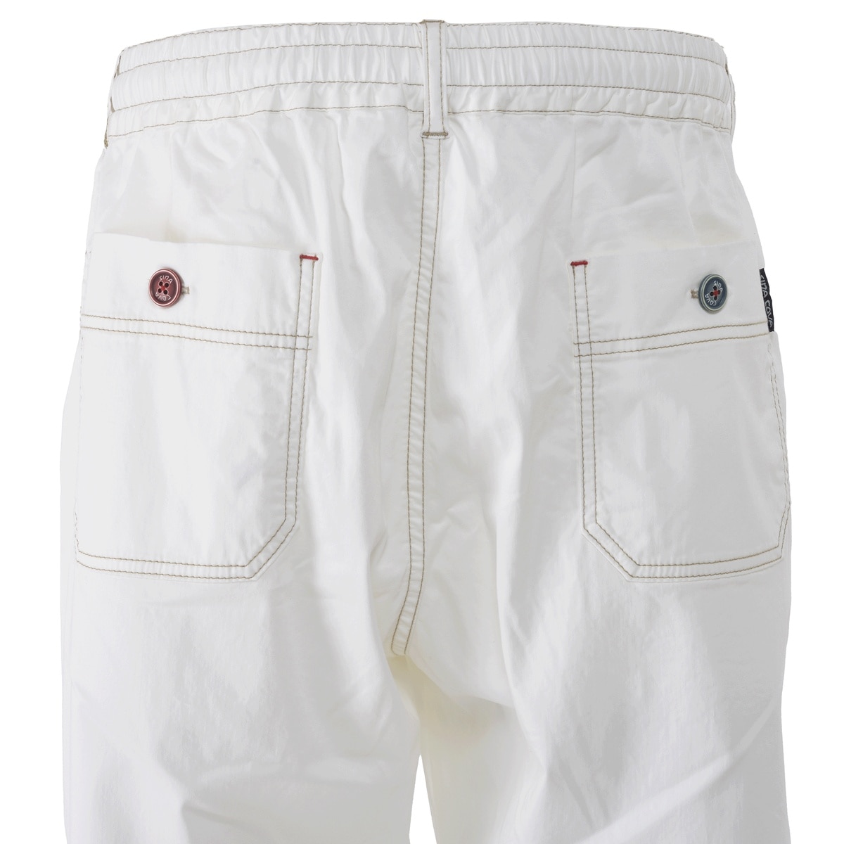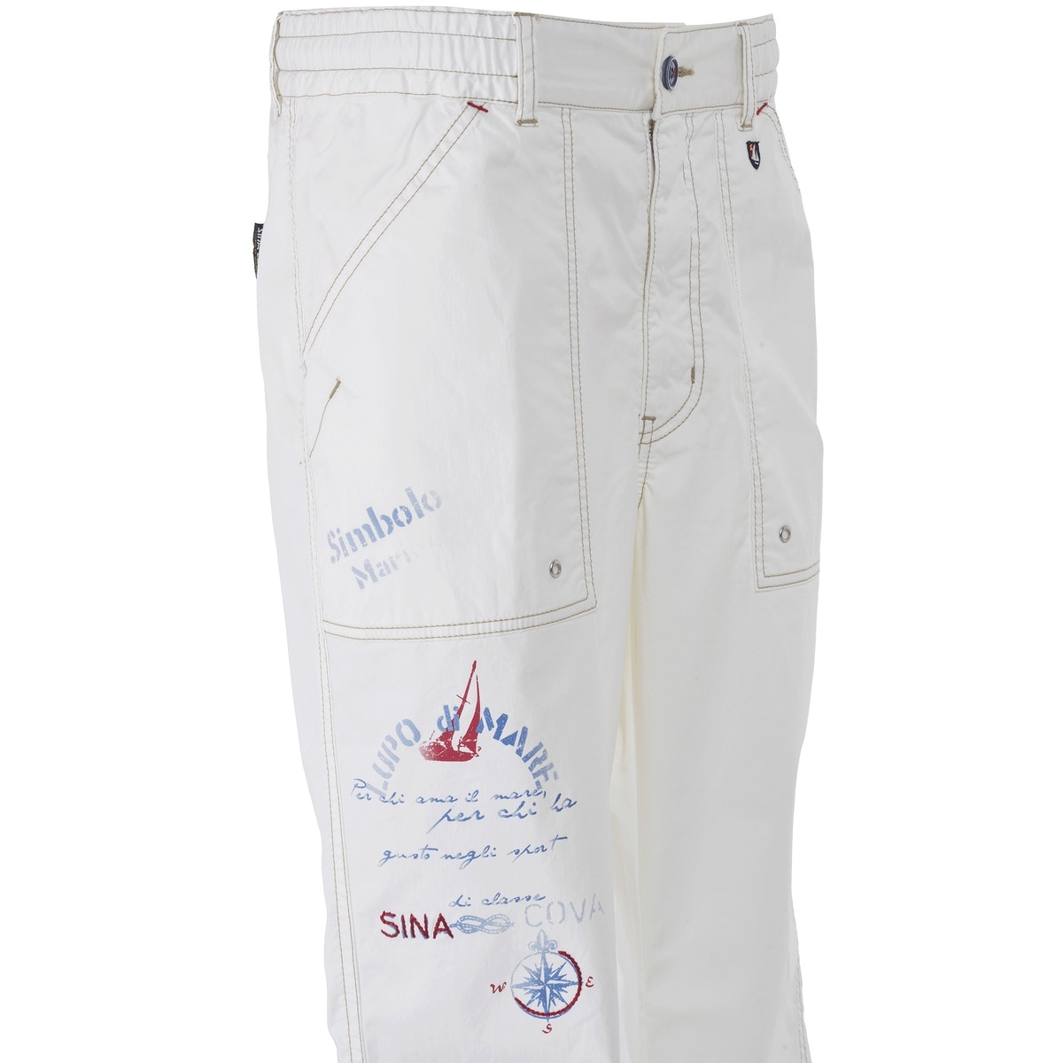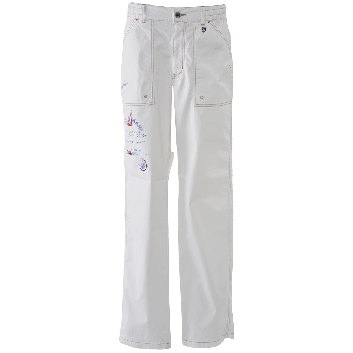 サテン組織によるなめらかな光沢と、ストレッチ性のある柔らかで伸びのあるストレートシルエットのマリンパンツです。右フロント部にシナコバならではの大胆なプリントや刺繍を施していて、ワンポイントアクセントとして楽しめます。またフロントポケット下部には鳩目を配置することで、マリン感を演出しています。その他、タックボタンやバックポケットのボタンにもこだわっていて、船舶の舷光をボタンの色で表現しています。ウエストゴム仕様かつウエスト紐で腰回りのサイズ調整も容易な為、お好みの着丈で着用いただけます。・ストレートシルエット・マリンパンツ・プリントアクセント・マリンコーデ・サテン生地・フロントポケット×2、バックポケット×2サテン・・・糸の浮き沈みの変化が少ない編み方で編まれた生地の総称。特徴として、すべすべ感や光沢感が現れるのが特徴的