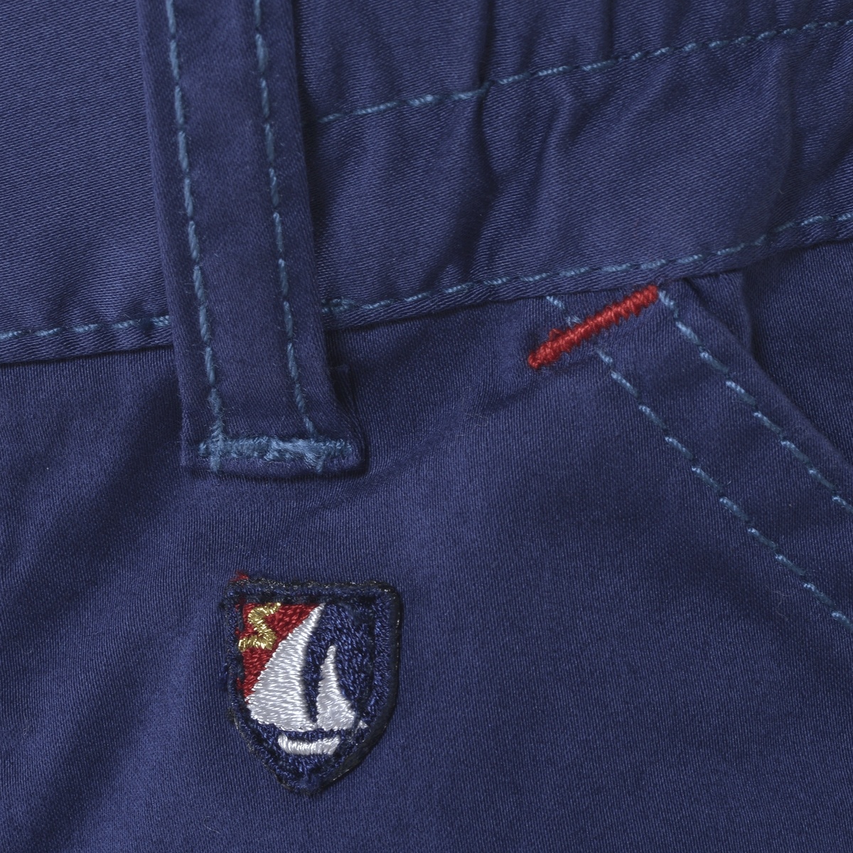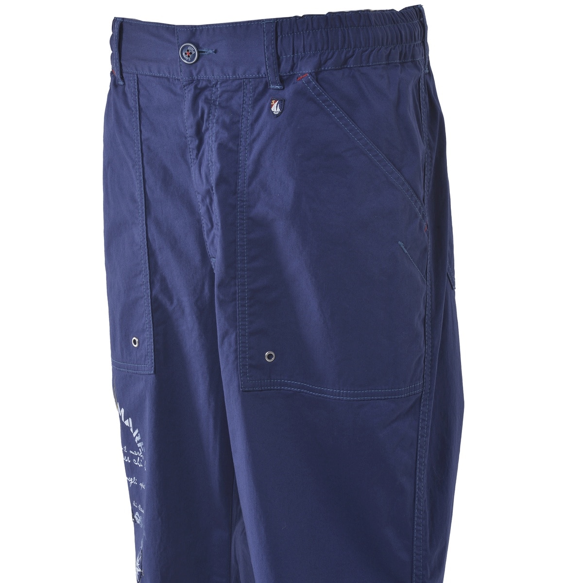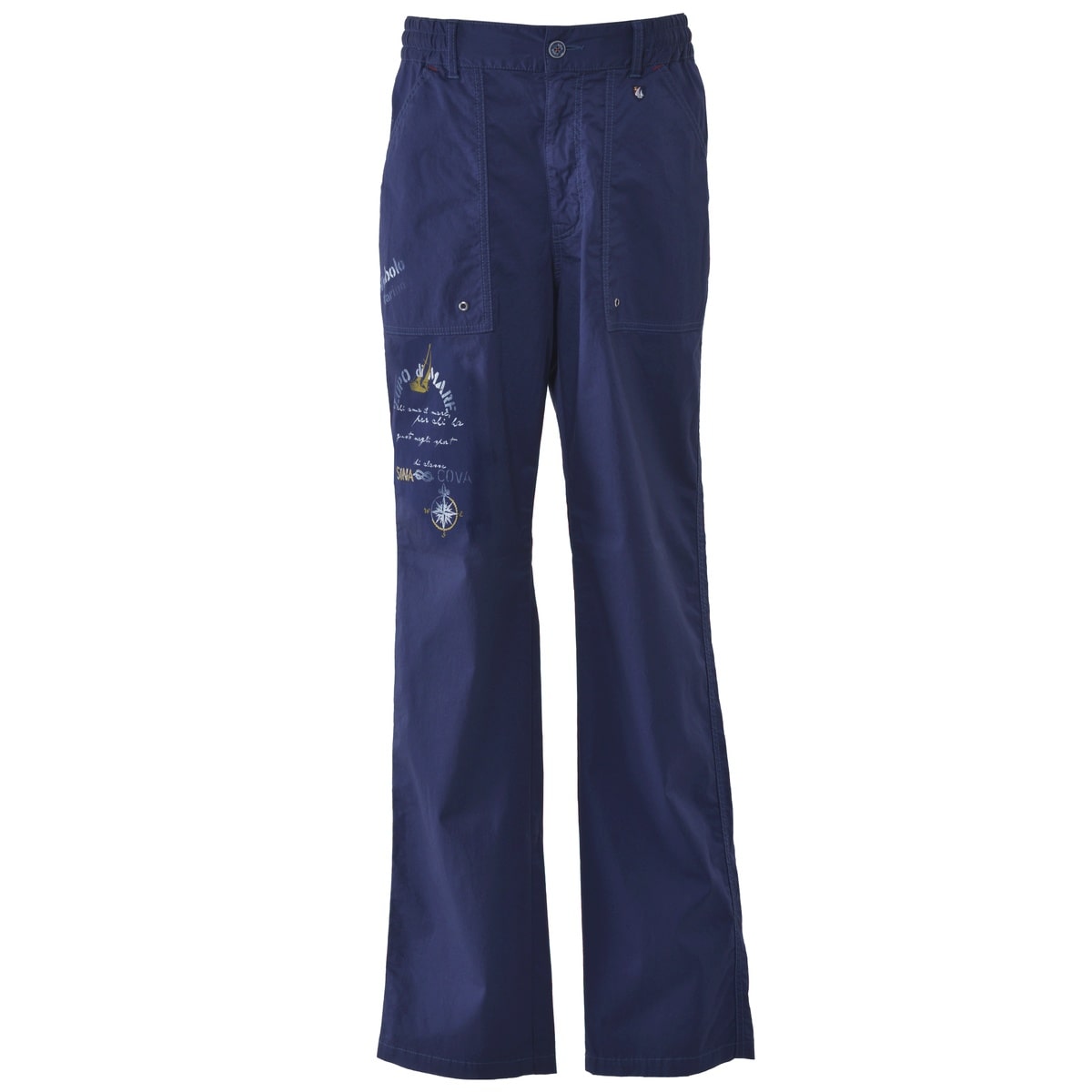 サテン組織によるなめらかな光沢と、ストレッチ性のある柔らかで伸びのあるストレートシルエットのマリンパンツです。右フロント部にシナコバならではの大胆なプリントや刺繍を施していて、ワンポイントアクセントとして楽しめます。またフロントポケット下部には鳩目を配置することで、マリン感を演出しています。その他、タックボタンやバックポケットのボタンにもこだわっていて、船舶の舷光をボタンの色で表現しています。ウエストゴム仕様かつウエスト紐で腰回りのサイズ調整も容易な為、お好みの着丈で着用いただけます。・ストレートシルエット・マリンパンツ・プリントアクセント・マリンコーデ・サテン生地・フロントポケット×2、バックポケット×2サテン・・・糸の浮き沈みの変化が少ない編み方で編まれた生地の総称。特徴として、すべすべ感や光沢感が現れるのが特徴的