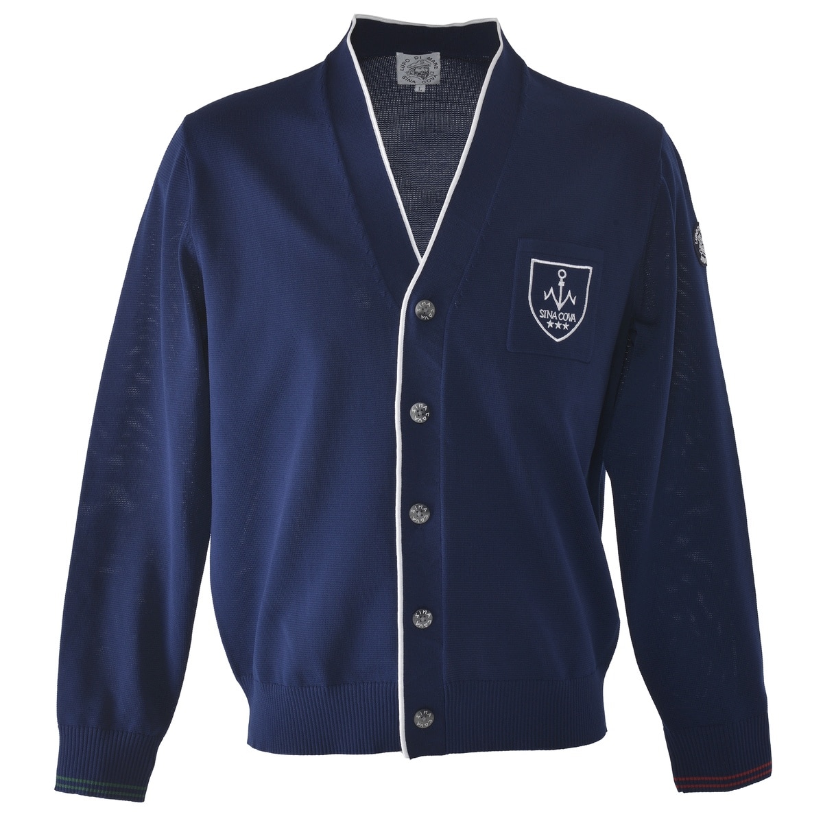エンブレム調の刺繍を胸ポケットにデザインしたラフ過ぎないきれいめカーディガンです。ネックのVゾーンも開き過ぎないようにコンパクトにしカジュアルさを抑えました。抗菌防臭機能のポリエステル糸を使用し夏の冷房の体温調整に羽織物としてもお勧めです。ショートパンツや柄パンツと合わせてリゾートスタイルもお勧めです。スリーブリブ部分は左右でカラー変え(船の左舷:赤色 右舷:緑色)シナコバマリンを表現しています。・軽量・抗菌防臭・きれいめファッション・夏の体温調整用羽織物【SINA COVA 2024 Autumn & Winter Style Book】掲載商品モデル着用カラー:ネイビー男性 身長:180cm / 着用:L size