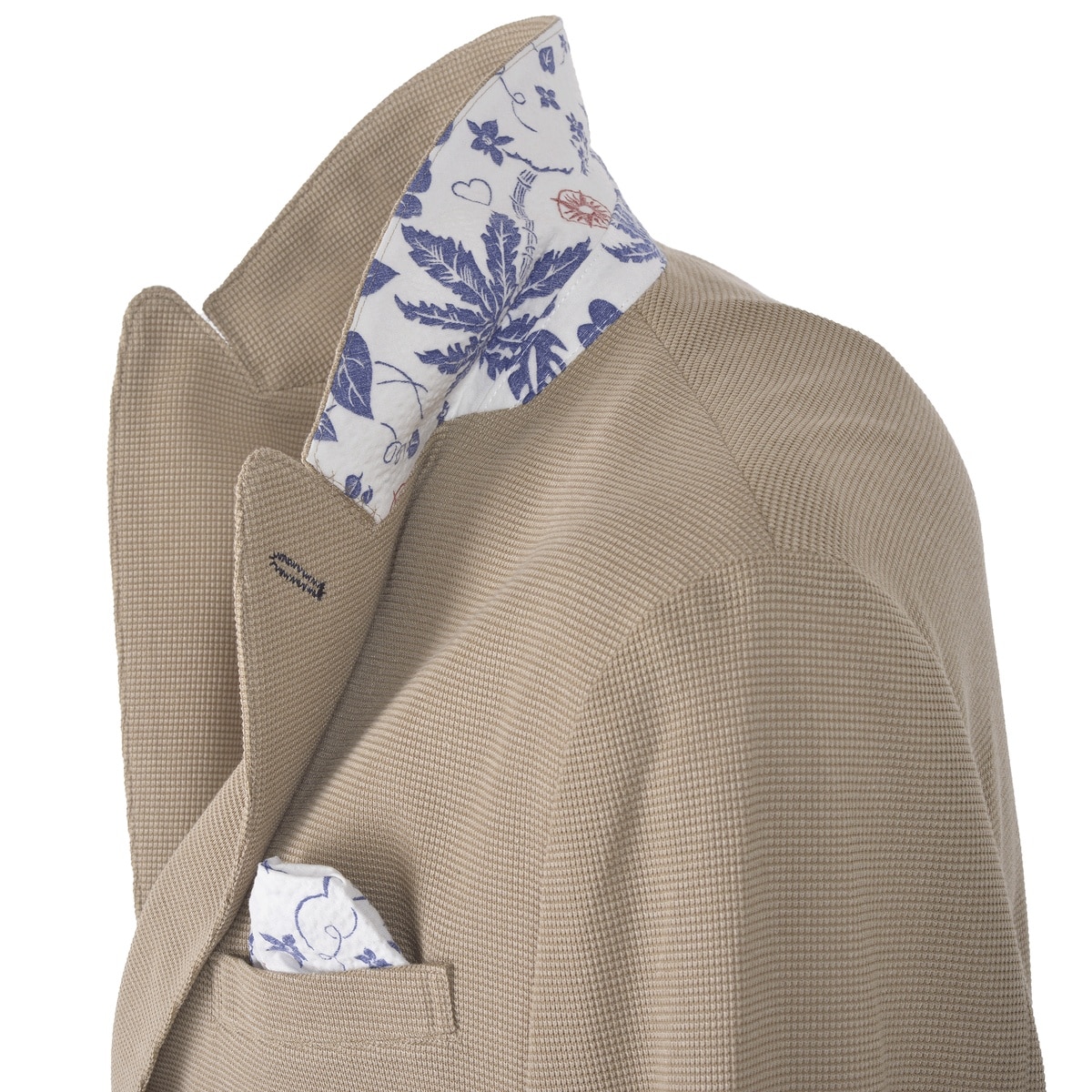 綿ポリエステルの混紡糸をハイゲージで編み上げたテーラードジャケットです。春夏に着るジャケットらしく、凹凸のあるミニワッフル状のニットを使用し、清涼感ある仕上がりとなっております。また、シナコバらしく胸ポケット・バックシーム・衿の裏地にはトロピカル柄の裏地を使用しており、胸ポケット裏地を商品画像のように出すことで、ハンカチーフ風の演出の可能になるアイテムです。・テーラードジャケット・サマーニット・ミニワッフル・トロピカル柄裏地【SINA COVA 2024 Spring & Summer Style Book】掲載商品モデル着用カラー:ベージュ男性 身長:180cm / 着用:L size