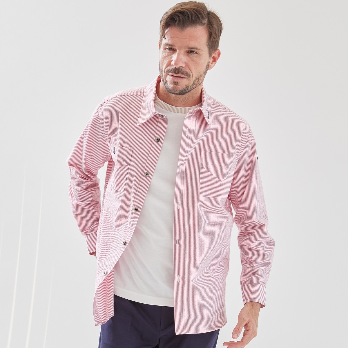 右胸にイカリ刺繍、衿にロゴ刺繍をあしらったCPOシャツジャケットです。90年代アメリカのヴィンテージパンツを参考に、アメリカ原産の綿を素材都市、カラッとした風合いと凹凸感による肌離れが生み出す通気性を両立したこだわり深い仕上がりになっております。春先の羽織ものとしてはもちろん、トレンドアイテムとしても魅力たっぷりのアイテムとなっております。・CPOシャツ・ドライ感・肌離れ◎・通気性〇・フロント:胸ポケット×2【SINA COVA 2024 Spring & Summer Style Book】掲載商品モデル着用 カラー:ブルー/ピンク男性 身長:180cm / 着用:L size
