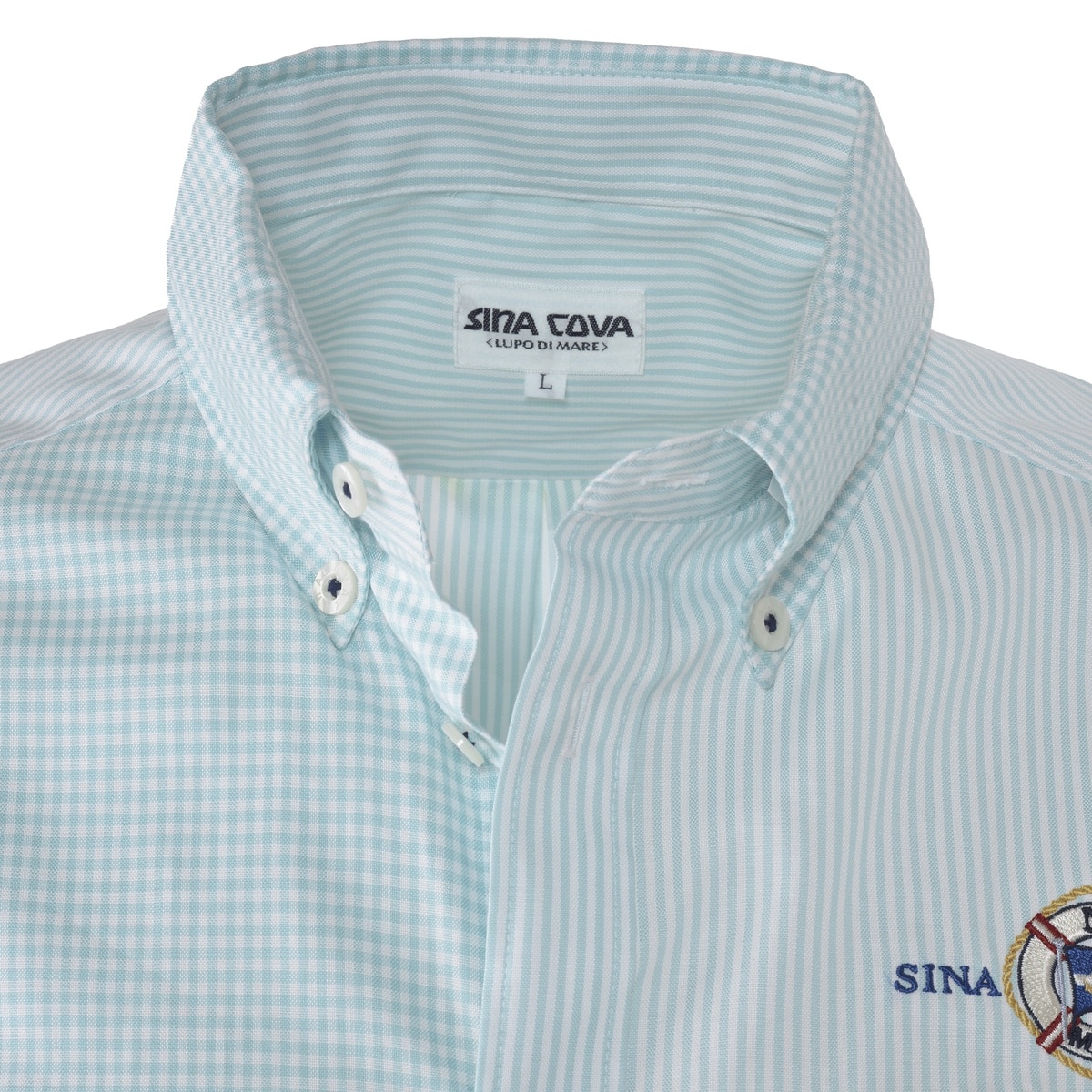 ギンガムチェックとストライプ柄を切替で仕上げたボタンダウンシャツ。