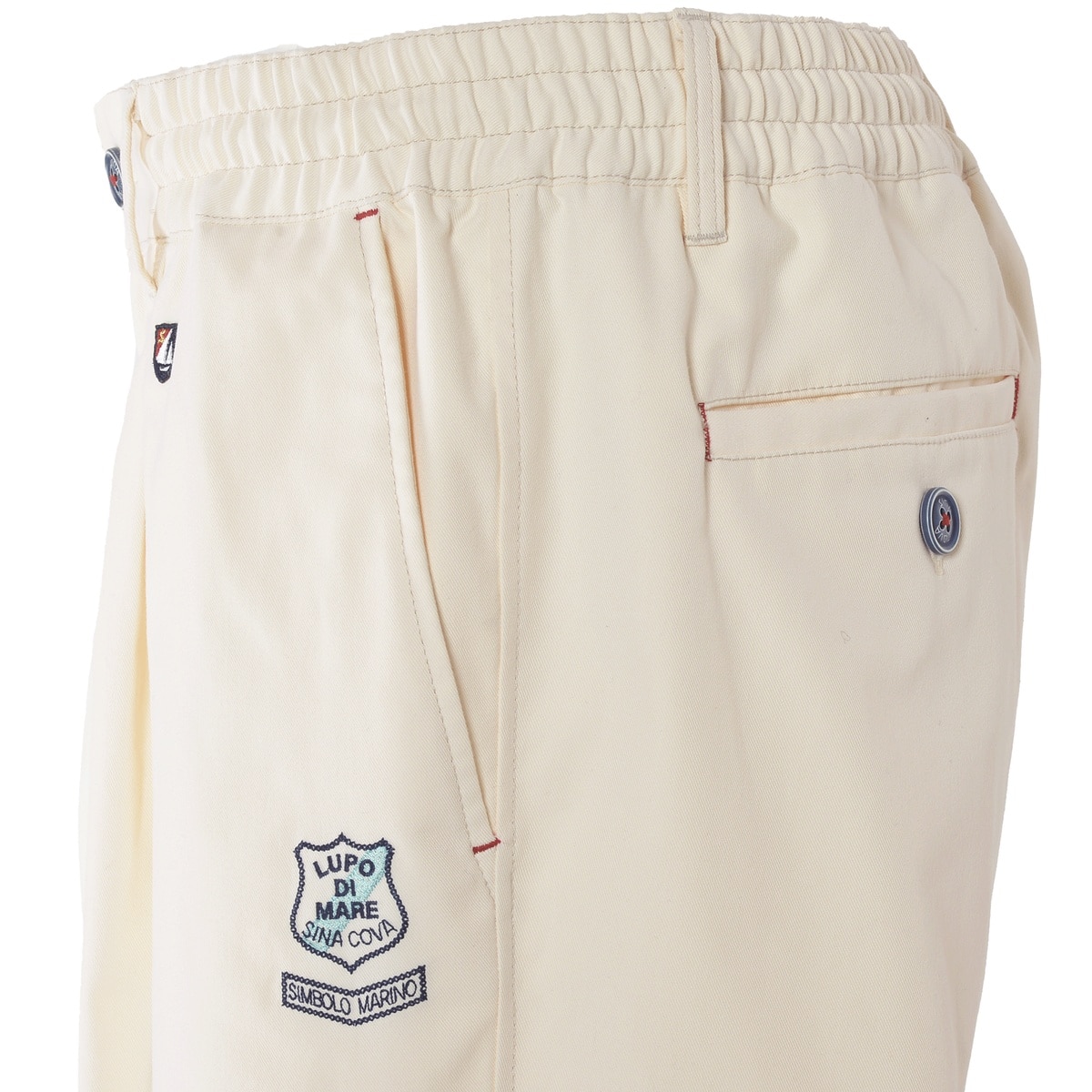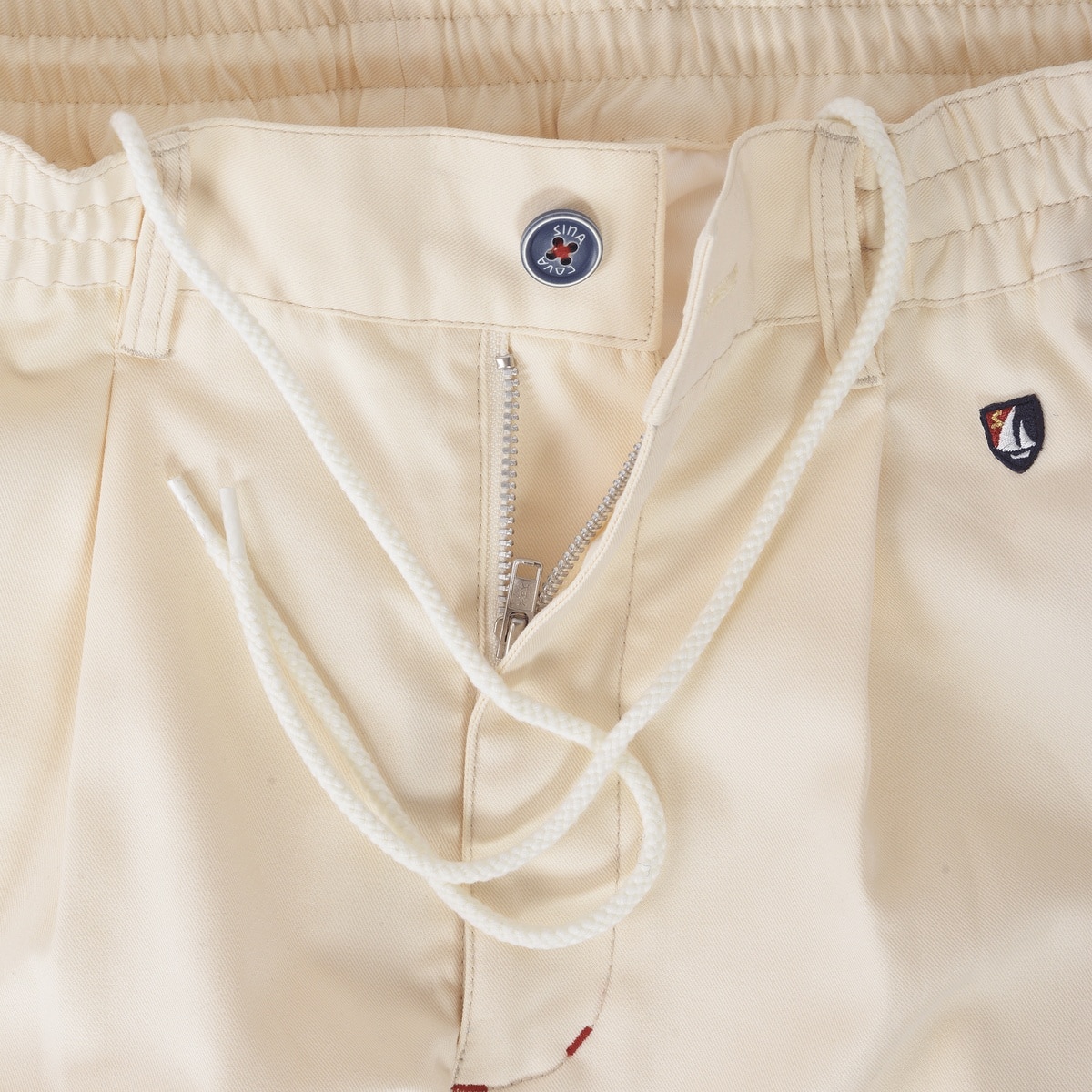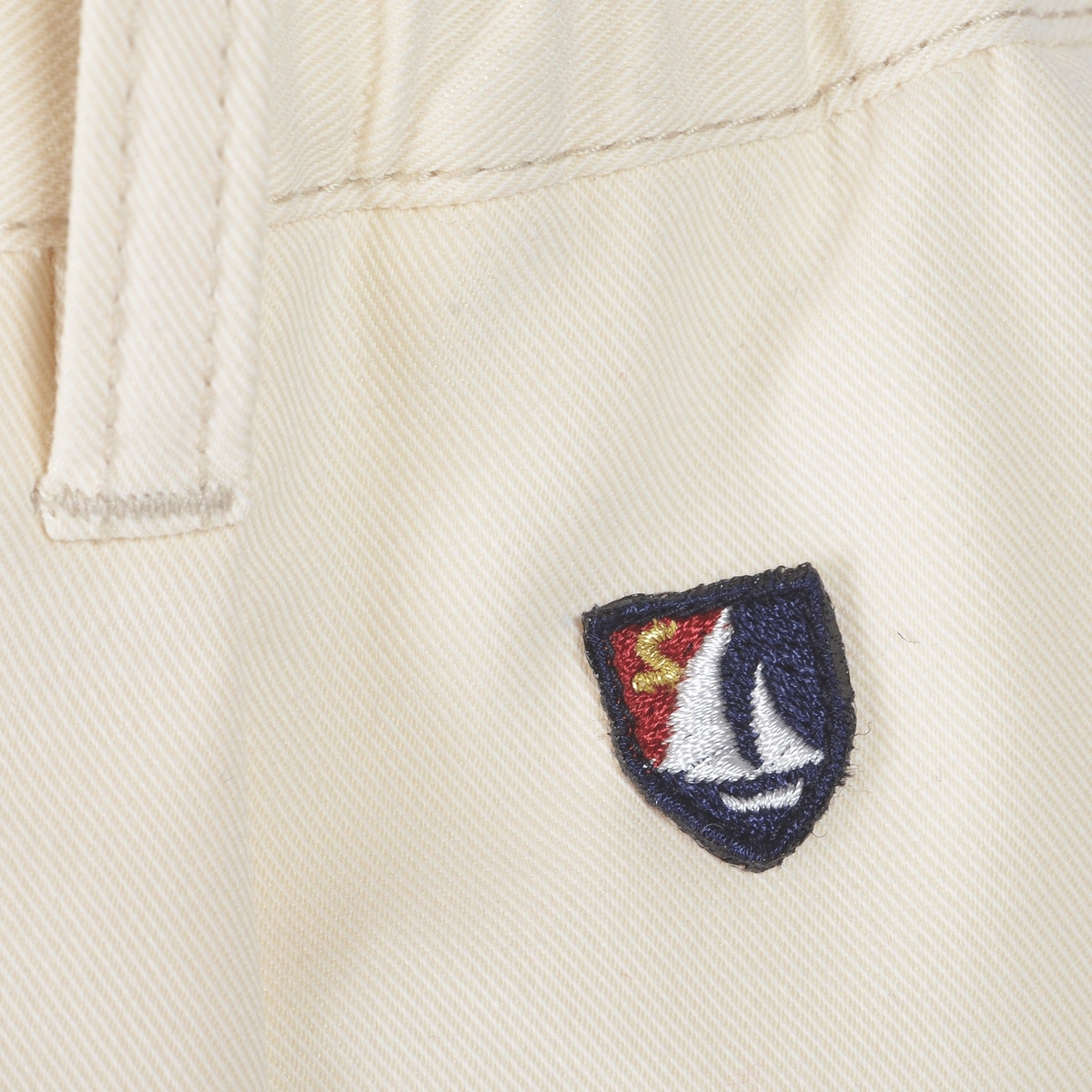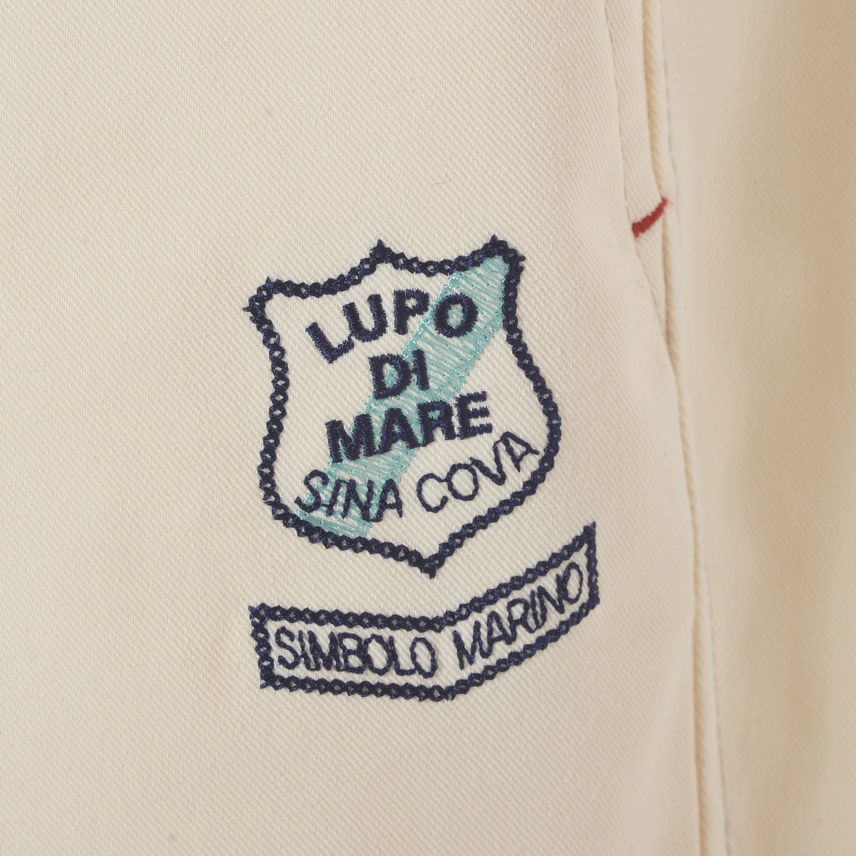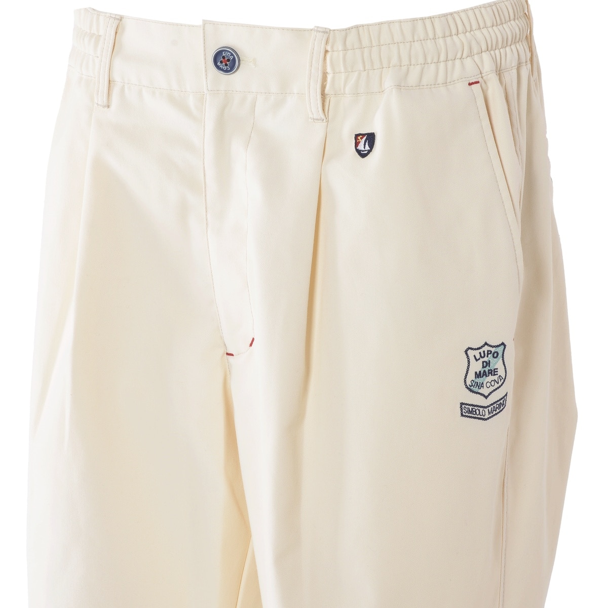 左フロントポケット部にワッペン風の刺繍を施したワンタックマリンパンツ。