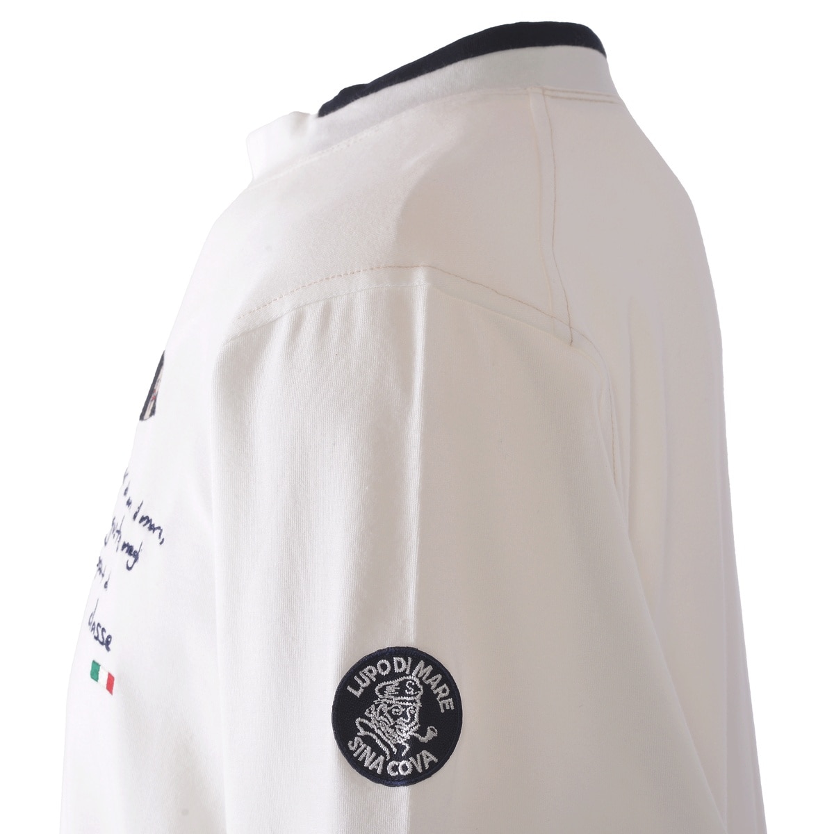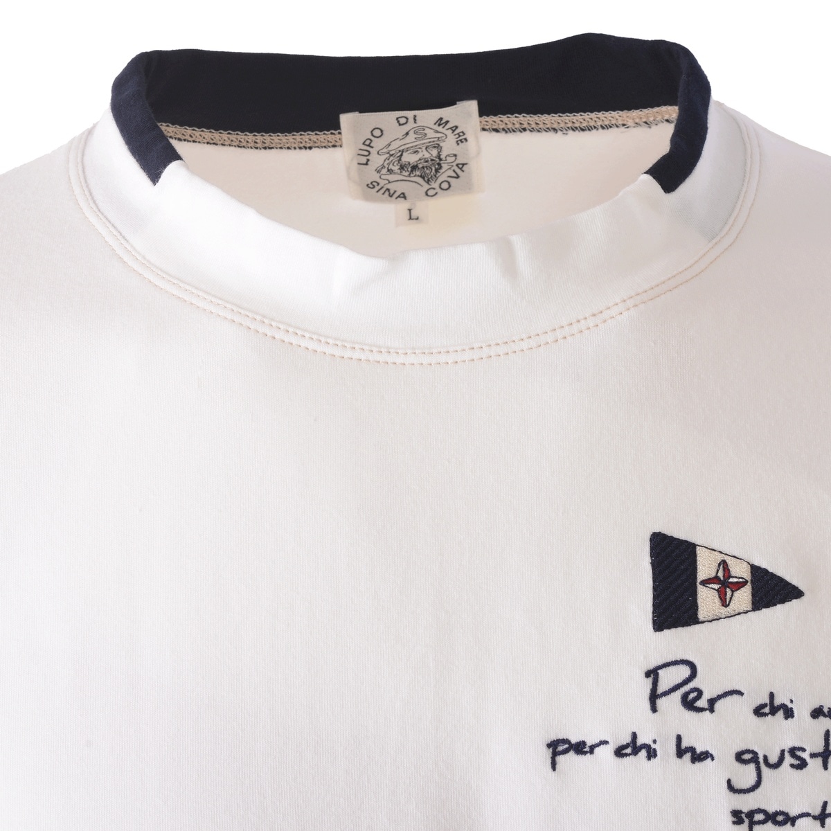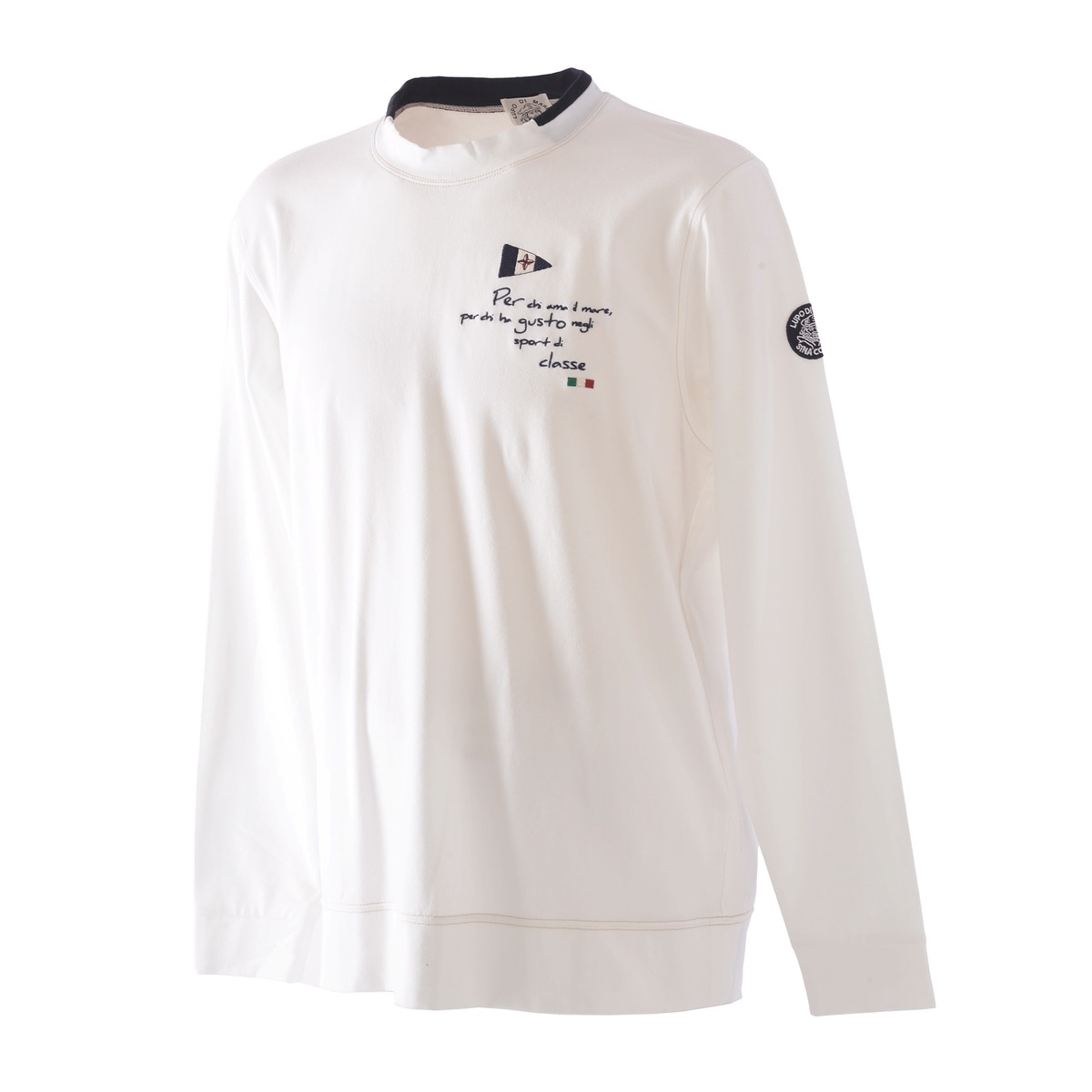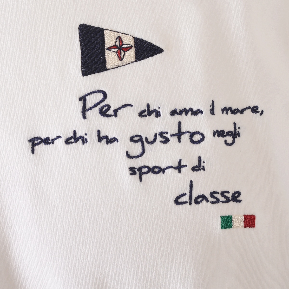 フロントにフラグと「per chi ama il mare , per chi ha gusto naegli sport di class 」の文字刺繍をデザインしたモックネック長袖Tシャツです。