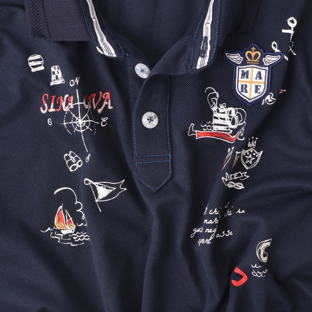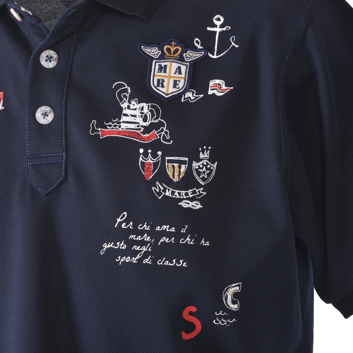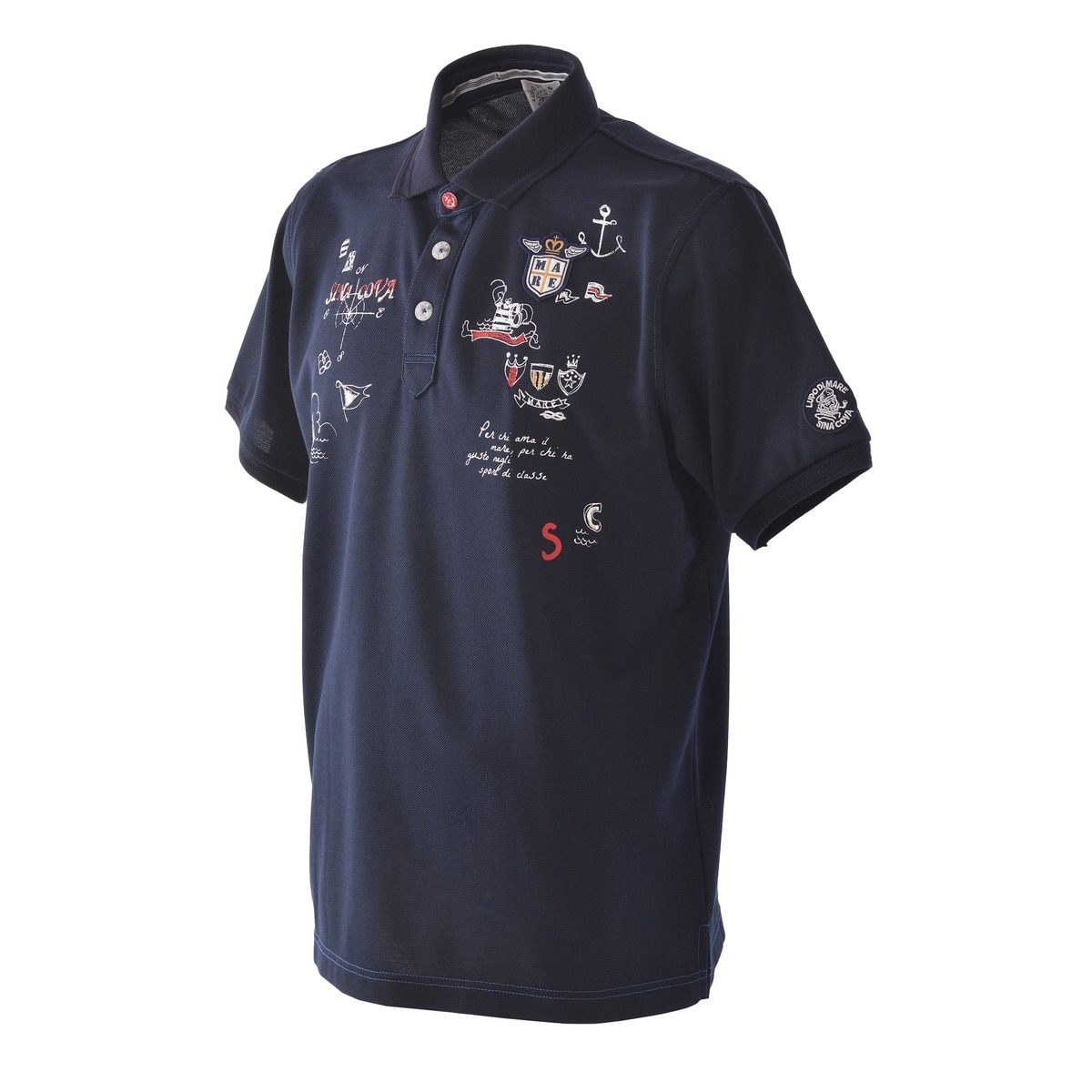 フロントには手書き風のキャプテンや海のモチーフプリントとエンブレム風ワッペンをデザインした半袖ポロシャツです。