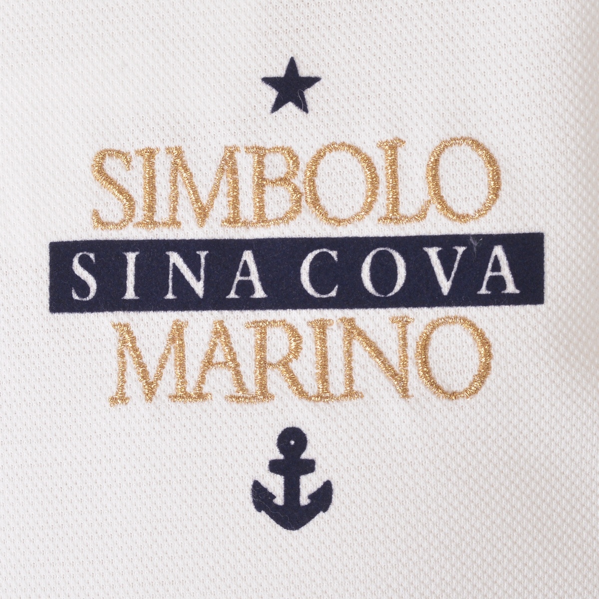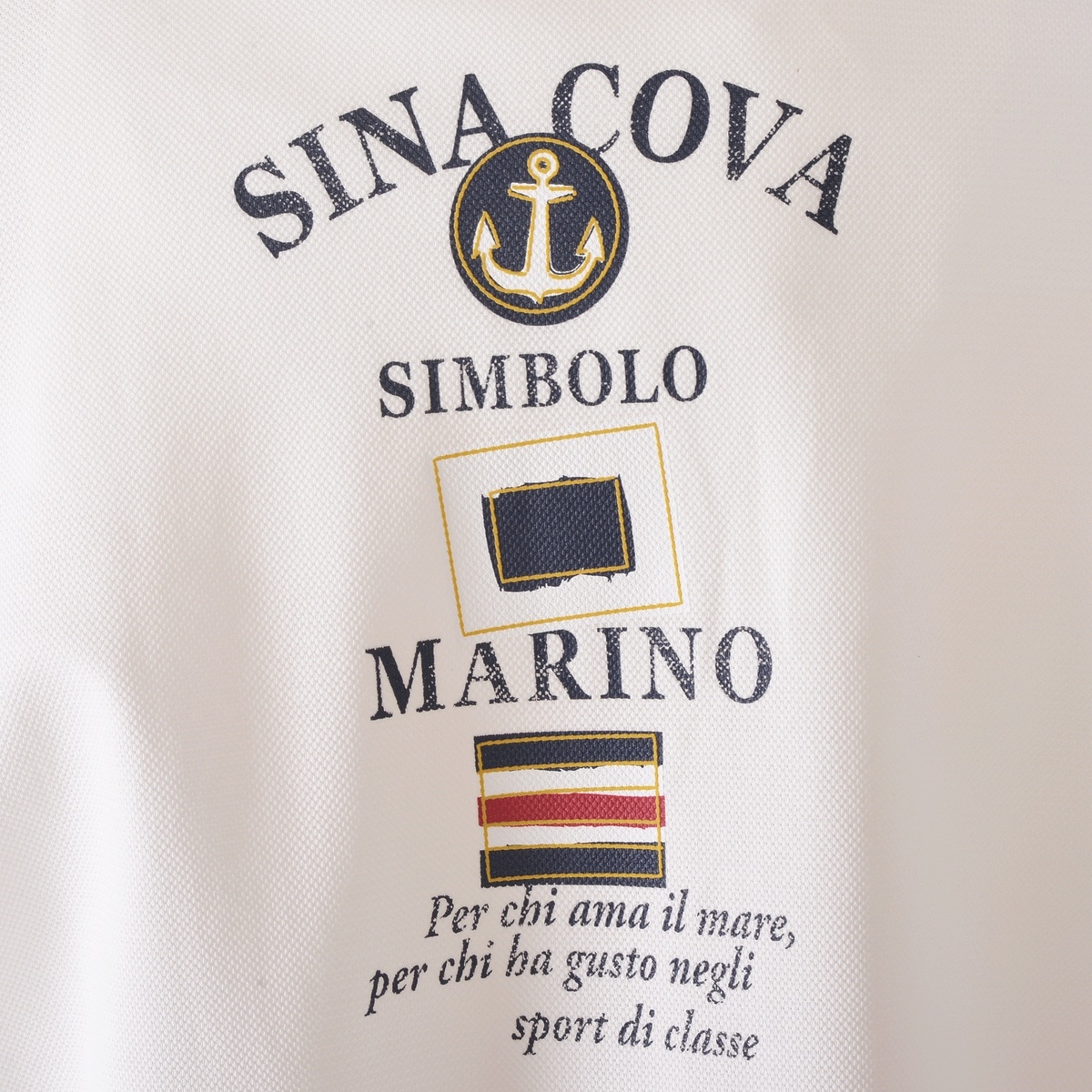 フロントに「SINA COVA」文字を刺繍とフロッキープリント、バックに手旗信号のフラッグモチーフをプリントをデザインした半袖ポロシャツです。