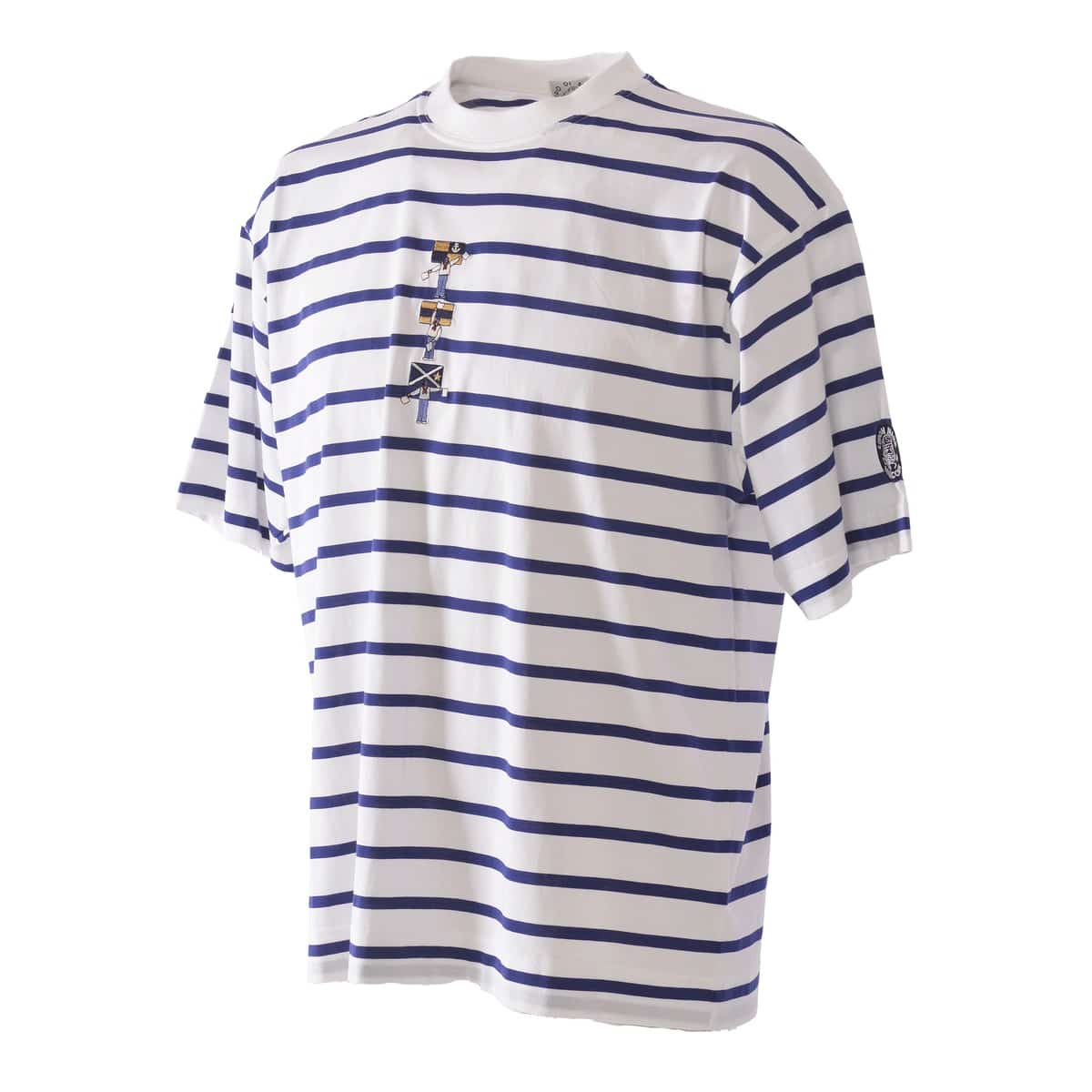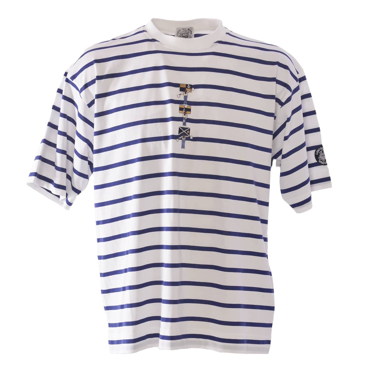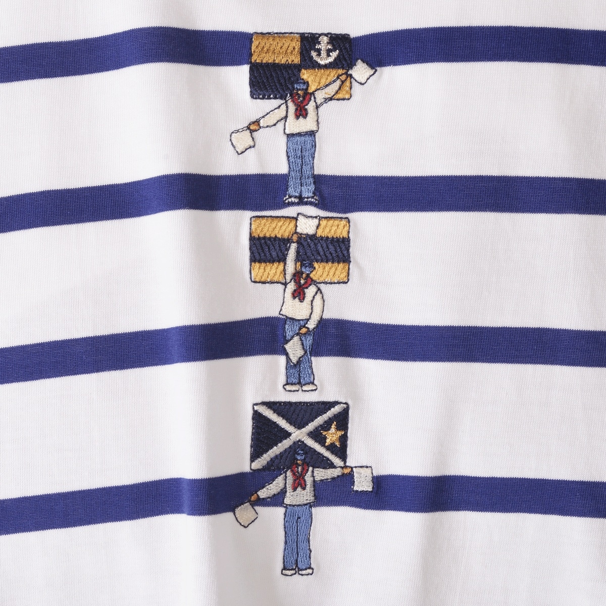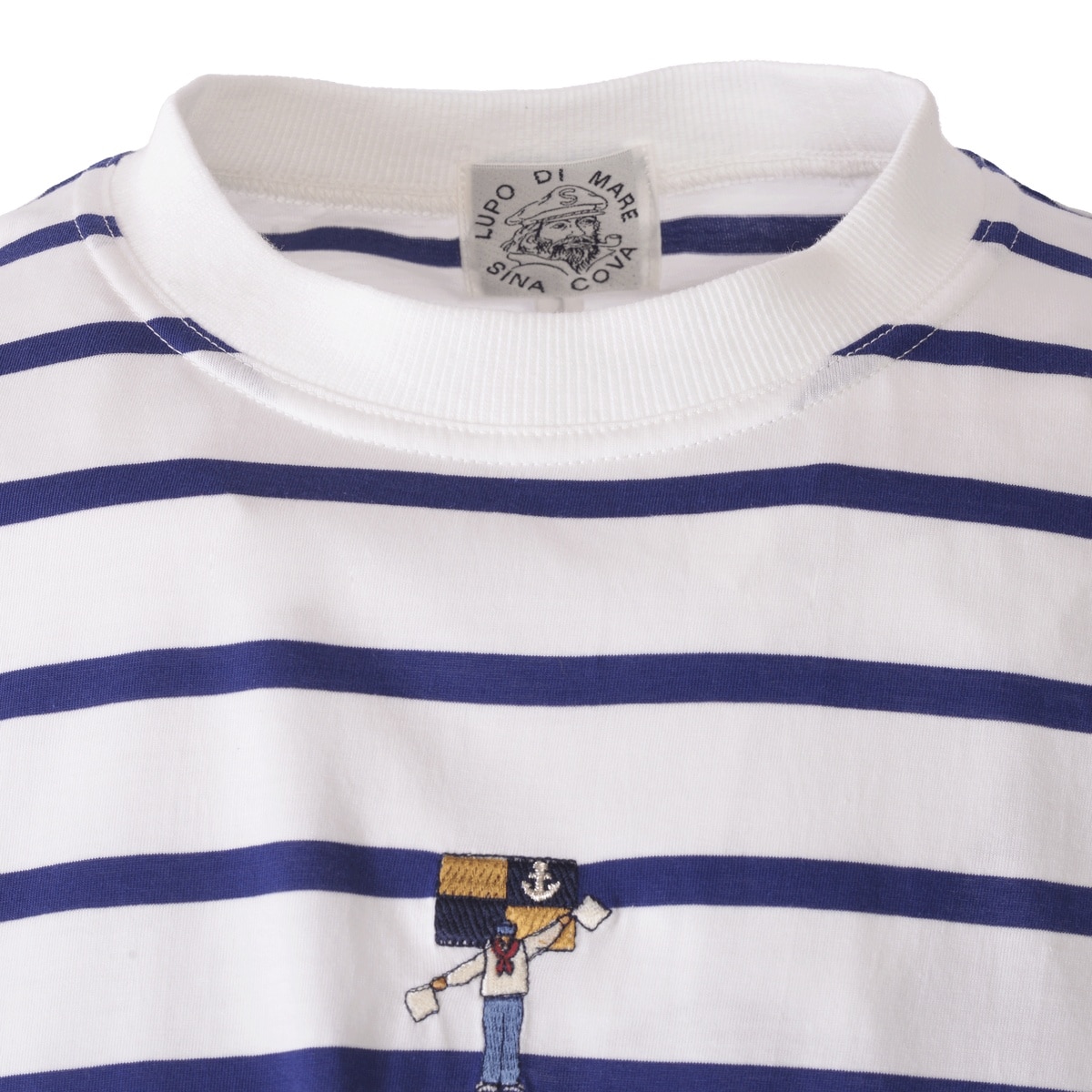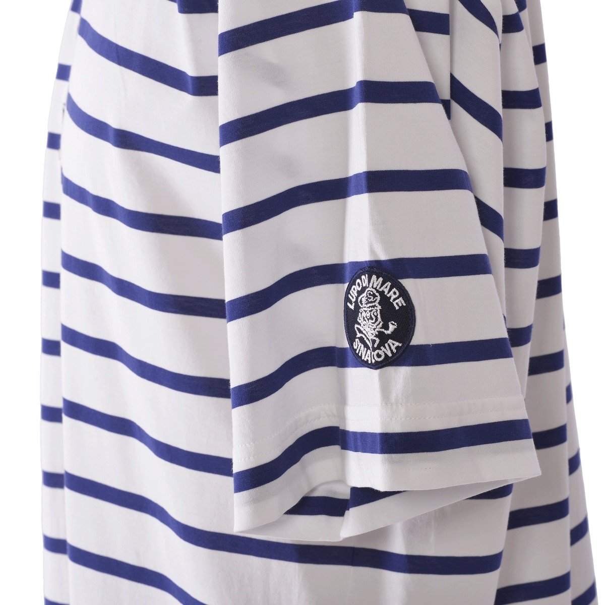 手旗信号でLUPO DI MAREの頭文字「L D M」を刺繍でデザインしたボーダー柄ドロップショルダー半袖Tシャツです。高品質な超長綿を72/2という絶妙な番手に仕上げ強撚タッチに撚糸を行いガス焼きをする事で毛羽をそぎ落しクリアーな表面感のボーダーの素材で、肌触りもよくハイゲージのため透けにくくなっているのも特徴です。・ゆったりとしたシルエット・肩の縫い目部分が落ちているドロップショルダー・透けにくい・サイズS~LL展開・男女兼用
