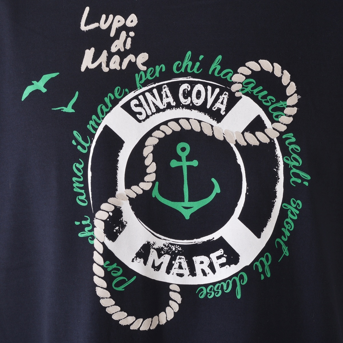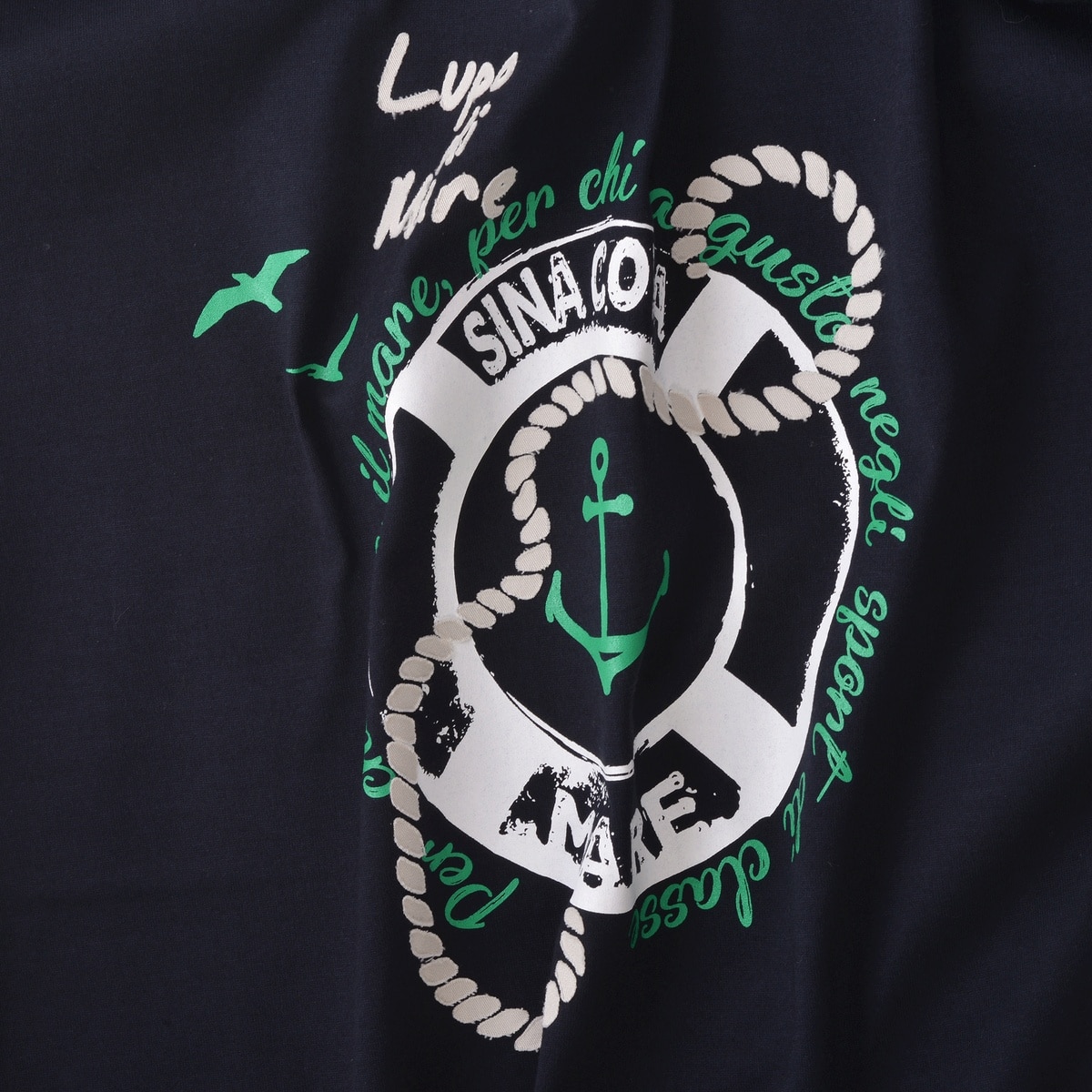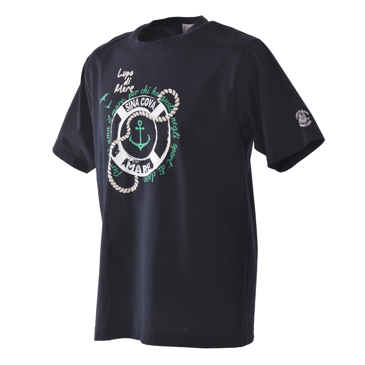 イカリと浮き輪をメインにシナコバロゴをオパール加工とプリントでデザインした半袖Tシャツです。