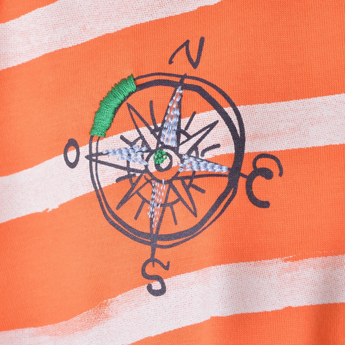 40/2のハイゲージで編み立て、ガス焼き工程を通す事で毛羽をそぎ落としたクリアーな表面感とシルケット加工により発色もよく耐久性にも優れ、肌触りがさらっとしているオリジナル素材のTシャツ。マリンと言えばボーダーが連想されるように、シナコバのボーダーイメージのパネル風の柄を施したTシャツです。ポーターと羅針盤、イカリ、ロゴ、旗、エンブレムと目いっぱいマリンのモチーフを使いプリントの上に刺繍を重ねる高度な手法でこだわった商品です。