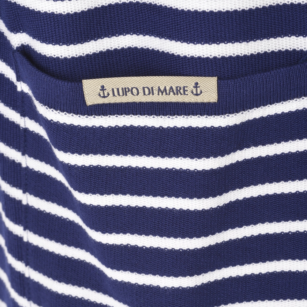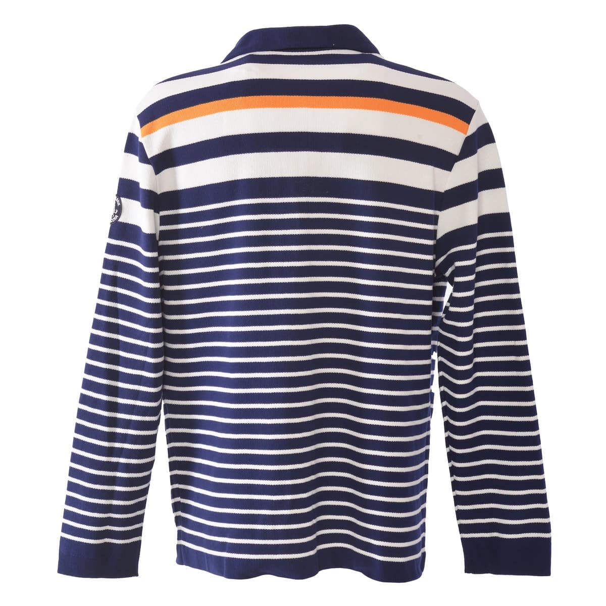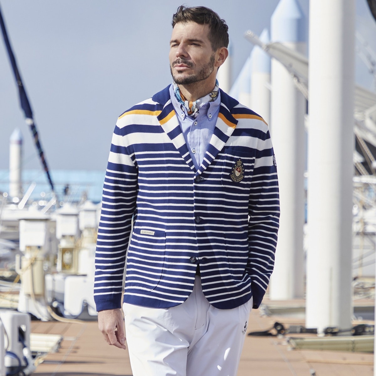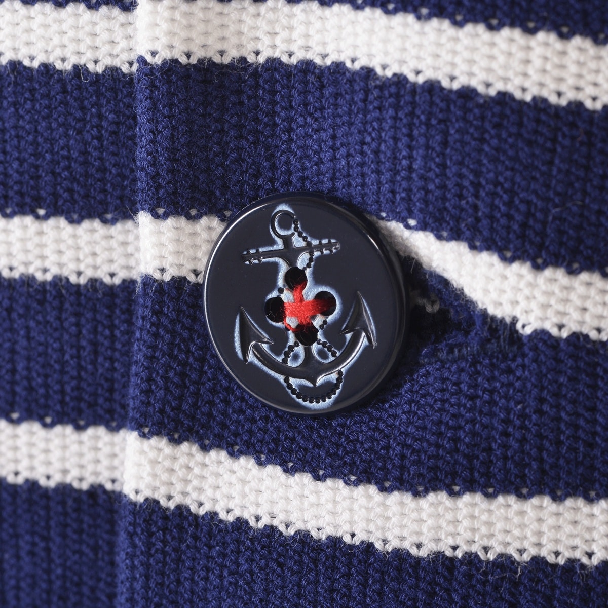 太ボーダーと細ボーダーを使用し、胸にエンブレムワッペンデザインしたニットジャケットです。