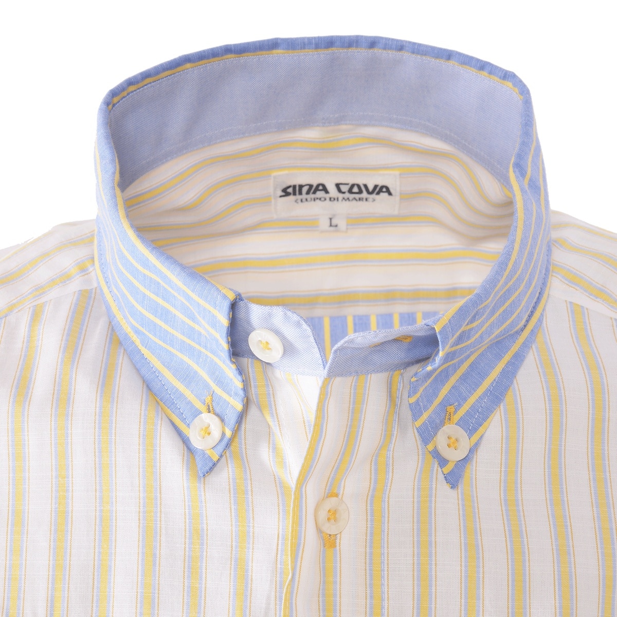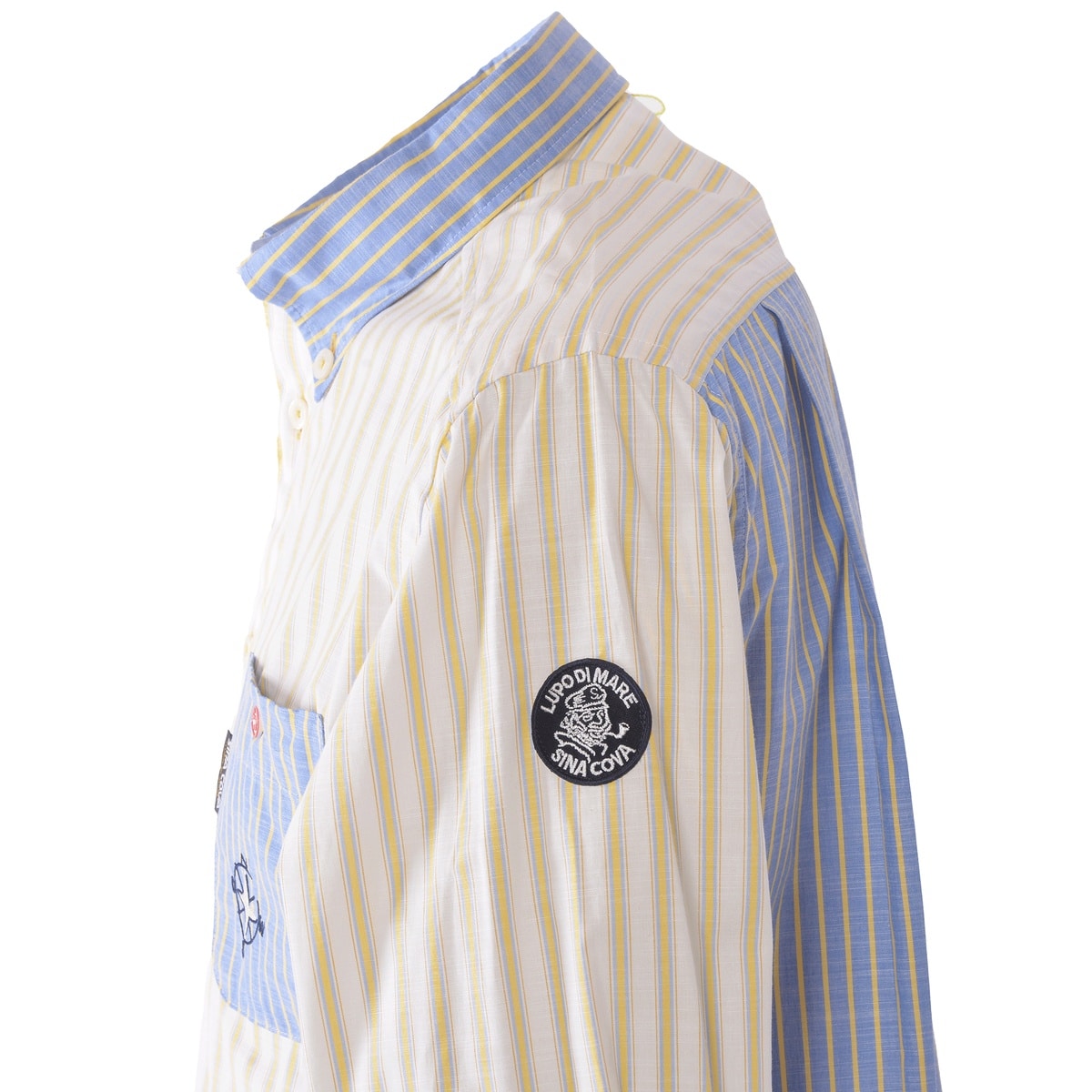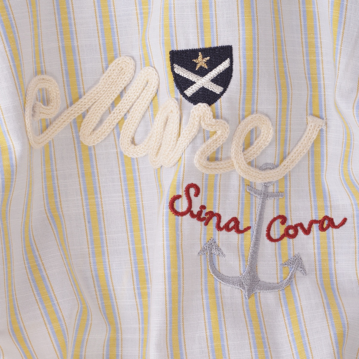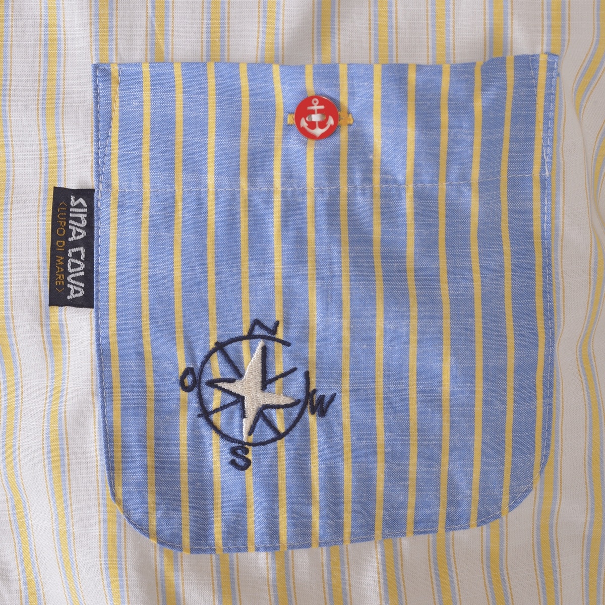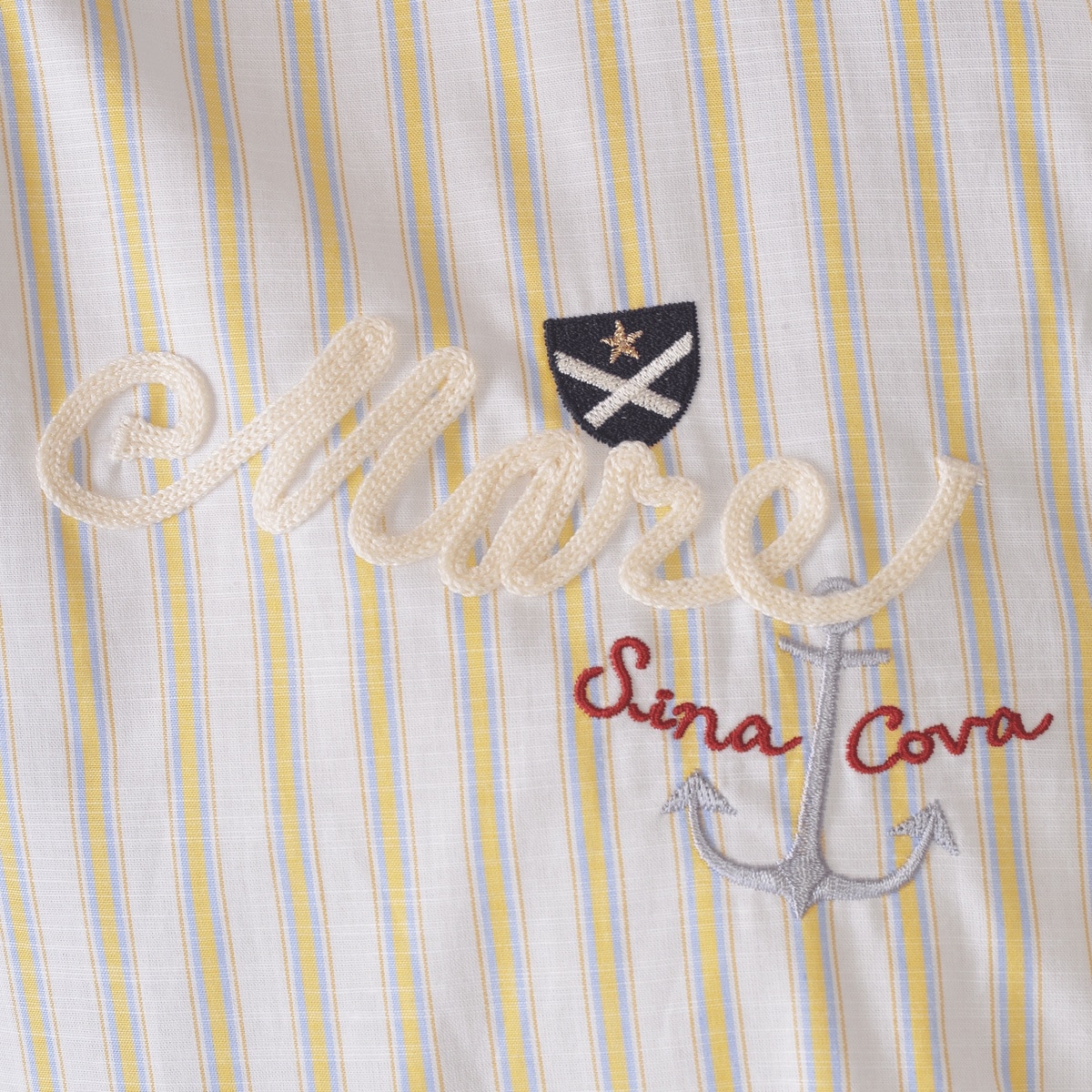 フロントに「MARE」のコード刺繍と「SINA COVA」、イカリ、羅針盤の刺繍をデザインしたストライプ柄長袖ボタンダウンシャツです。2種類のストライプ柄を各パーツに組み合わせ切替デザインシャツです。発色の良い海外の生地を使用しシナコバらしいカラーカジュアルシャツに仕上げました。・ヨーロッパ(トルコ)の生地を使用・切替デザイン・ストライプ柄・ボタンダウンシャツ・イカリボタン