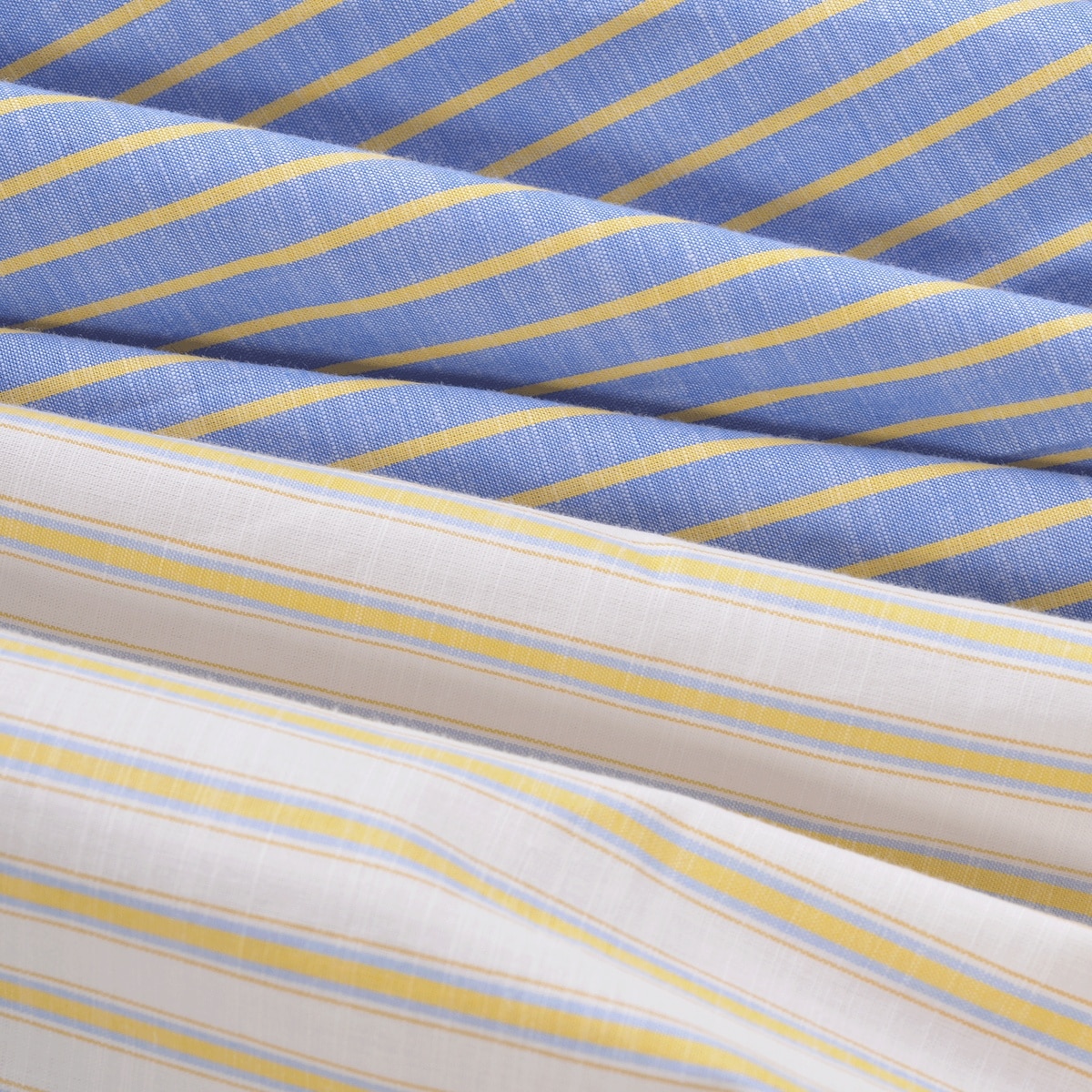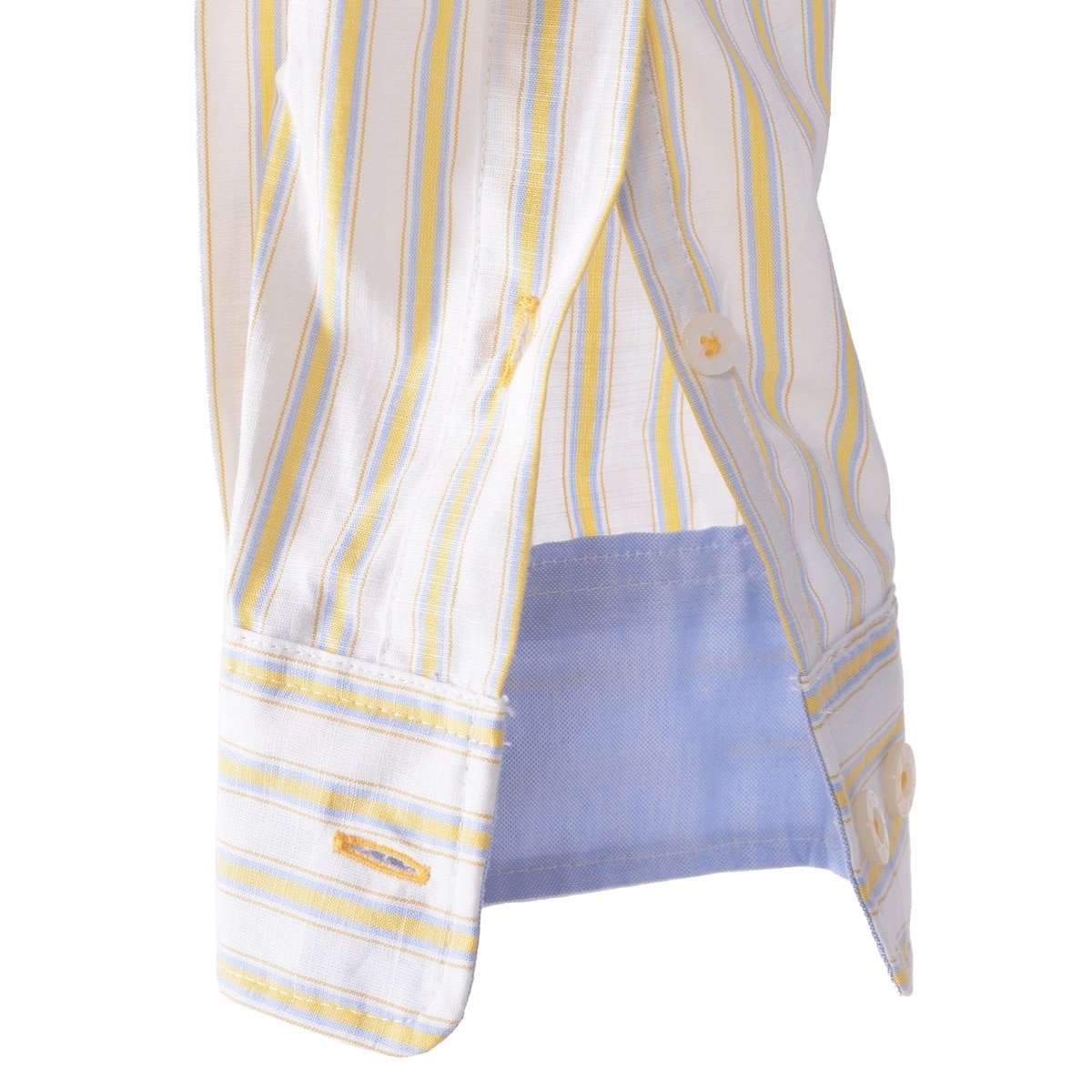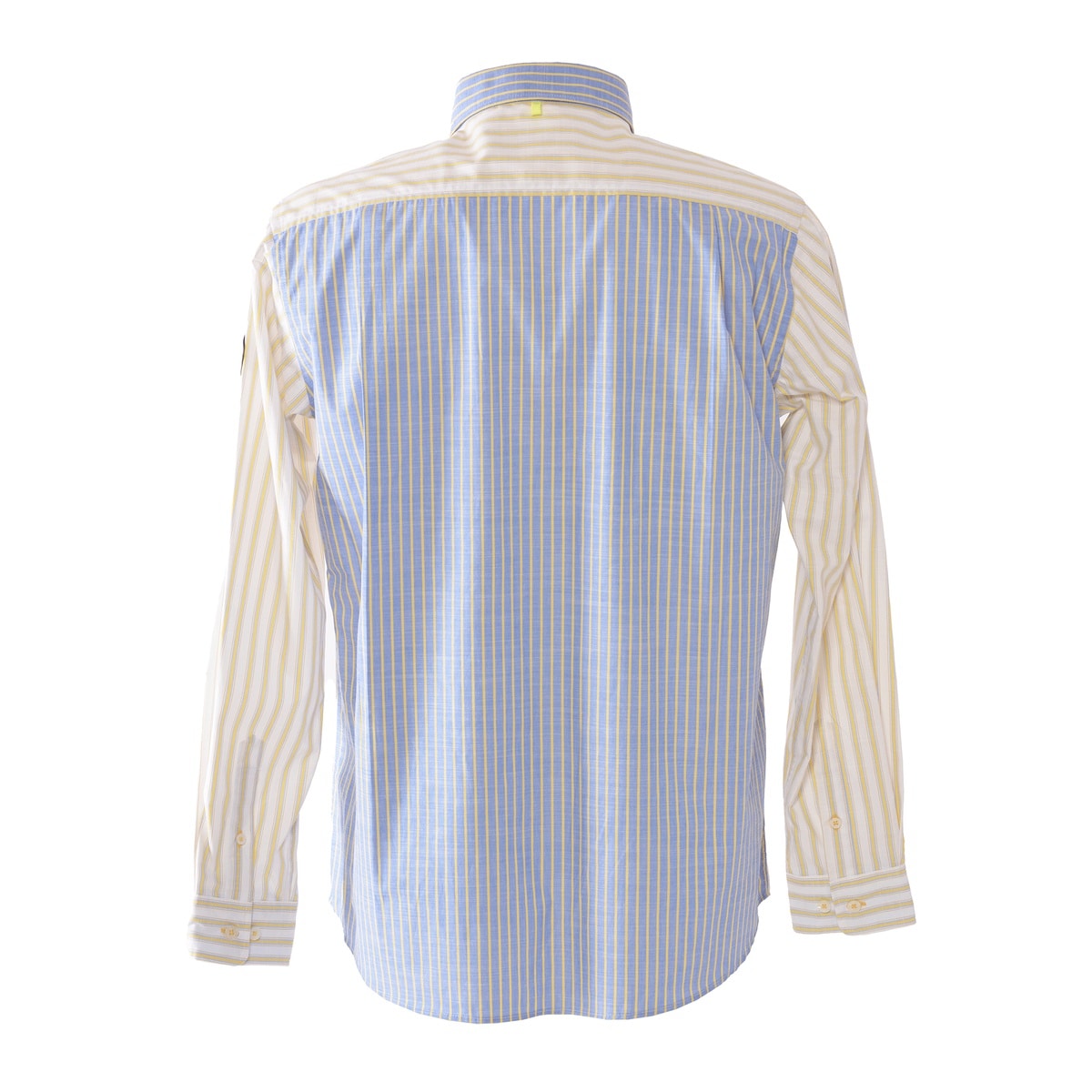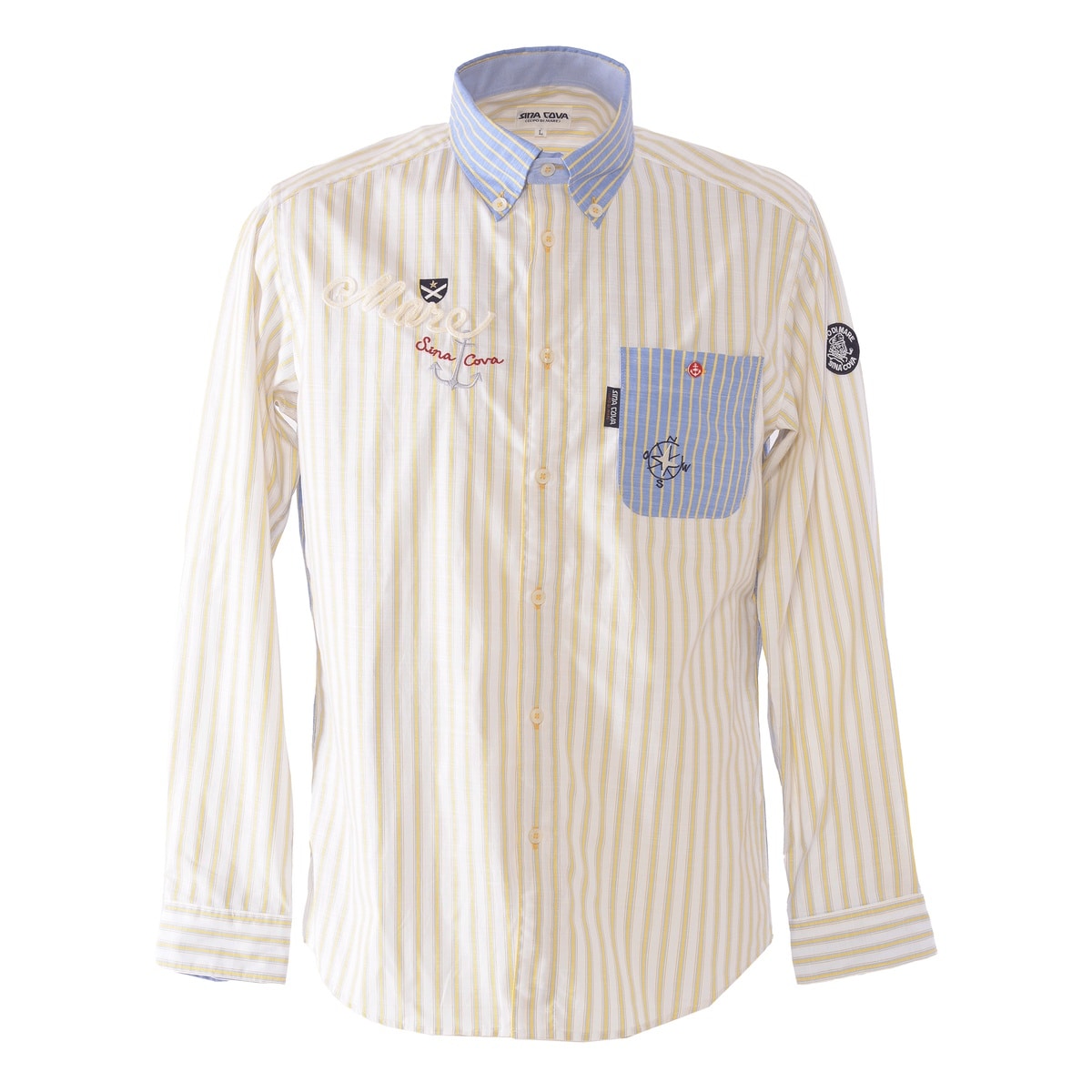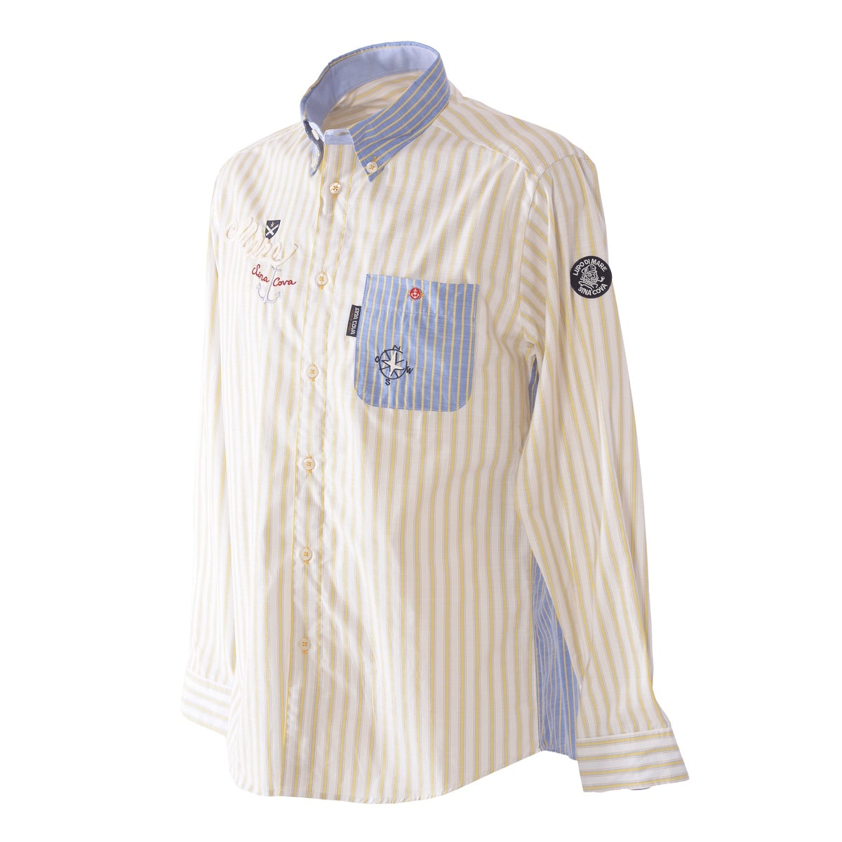 フロントに「MARE」のコード刺繍と「SINA COVA」、イカリ、羅針盤の刺繍をデザインしたストライプ柄長袖ボタンダウンシャツです。2種類のストライプ柄を各パーツに組み合わせ切替デザインシャツです。発色の良い海外の生地を使用しシナコバらしいカラーカジュアルシャツに仕上げました。・ヨーロッパ(トルコ)の生地を使用・切替デザイン・ストライプ柄・ボタンダウンシャツ・イカリボタン