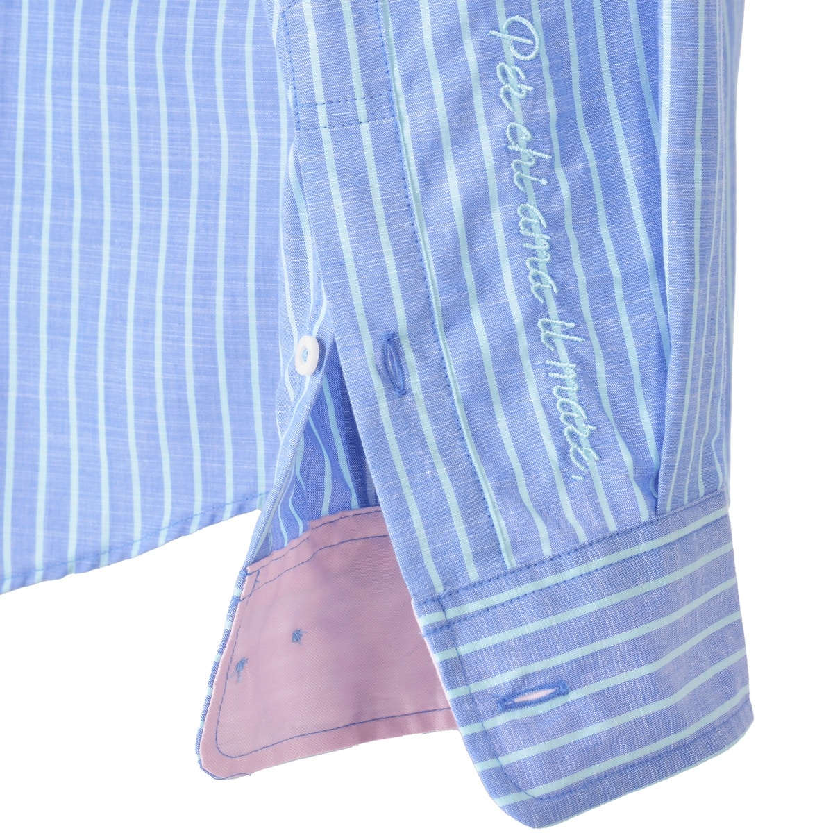 発色と綺麗なカラーが多いヨーロッパ(トルコ素材)のストライプ柄を使用したカジュアルシャツです。ポケットの上にワンポイントのイカリとフラッグの刺繍、そしてカフス剣ボロにメッセージ系の文字(海を愛する人のために)をさりげなく入れた商品に仕上げています。
