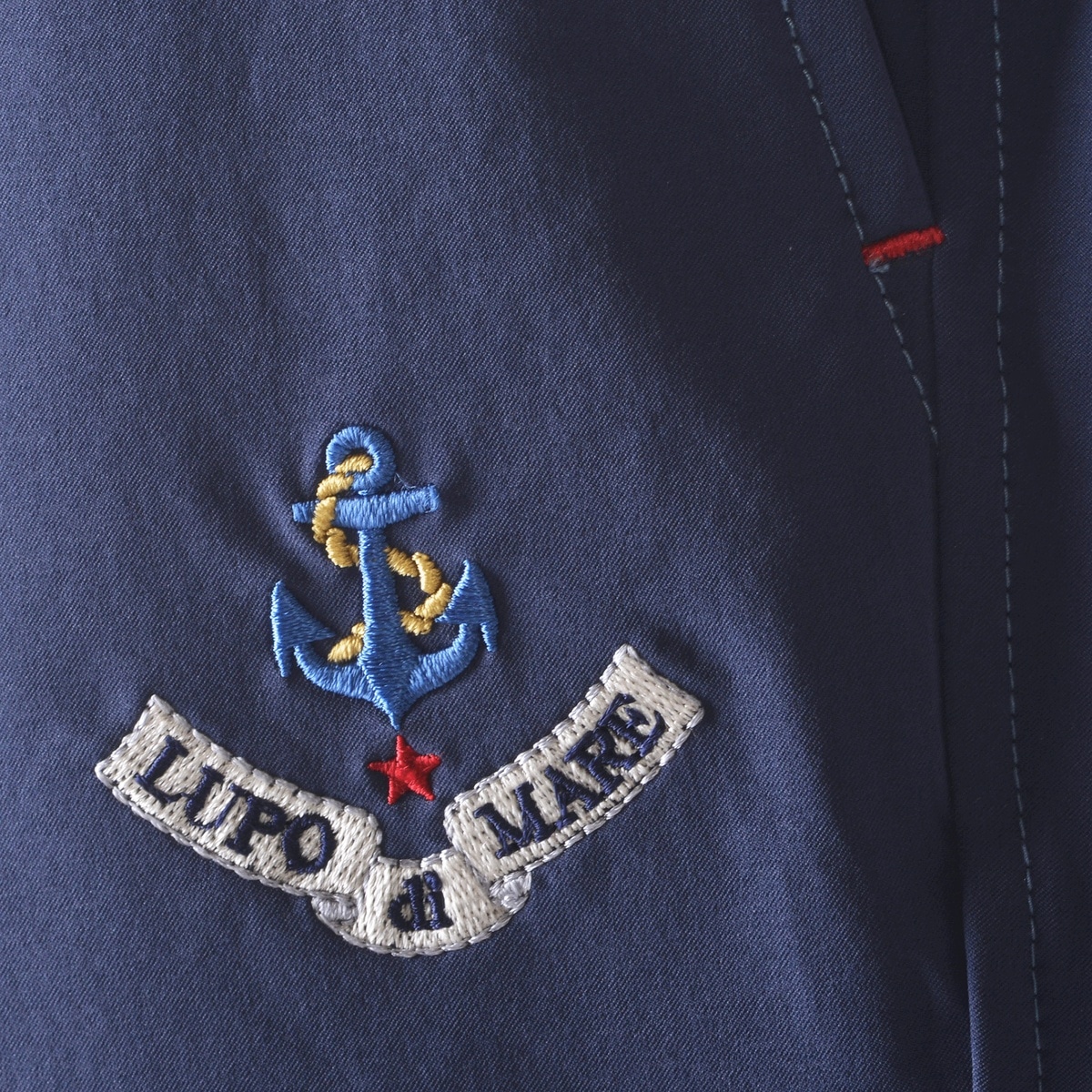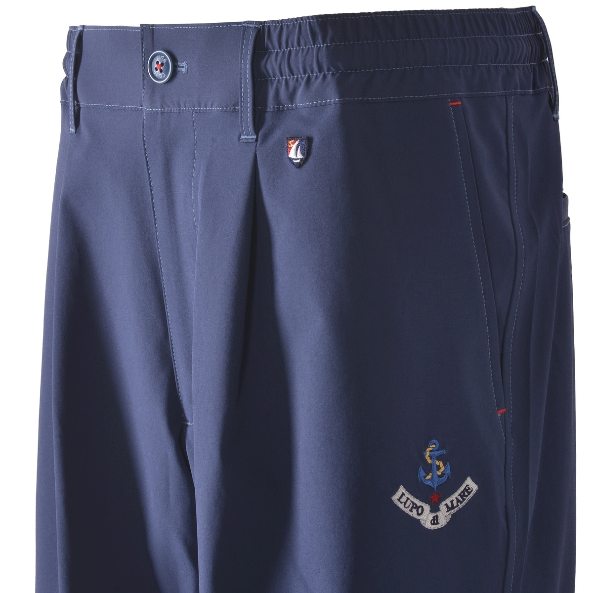 フロントにイカリと「LUPO DI MARE」の文字を刺繍でデザインしたワンタックマリンパンツです。
