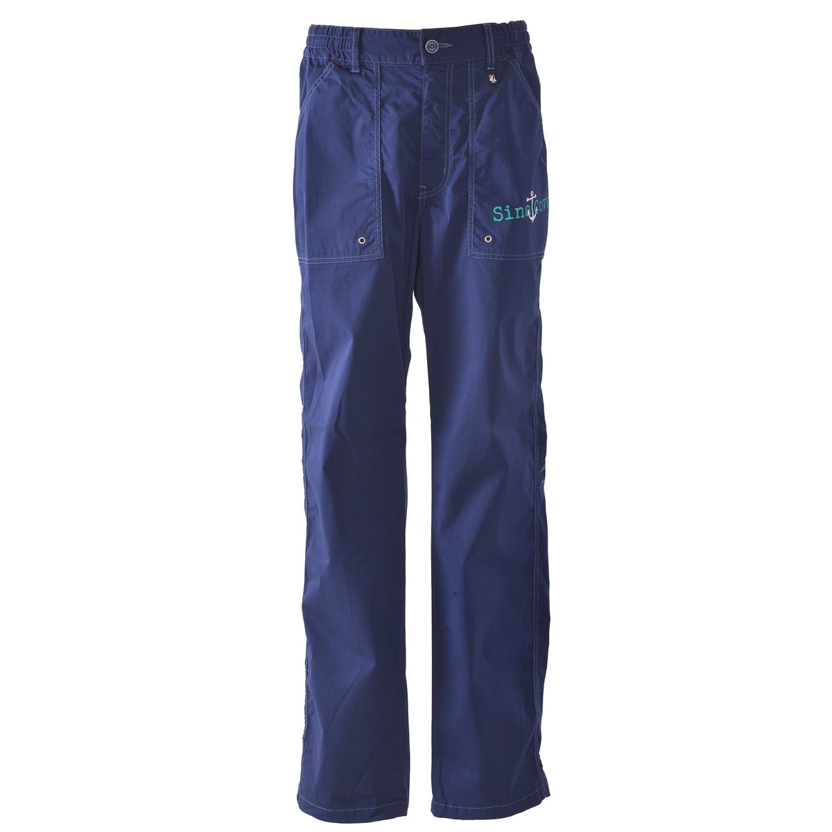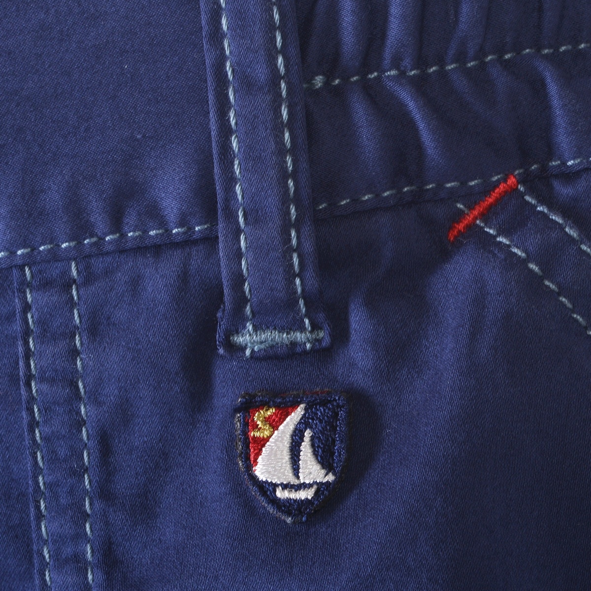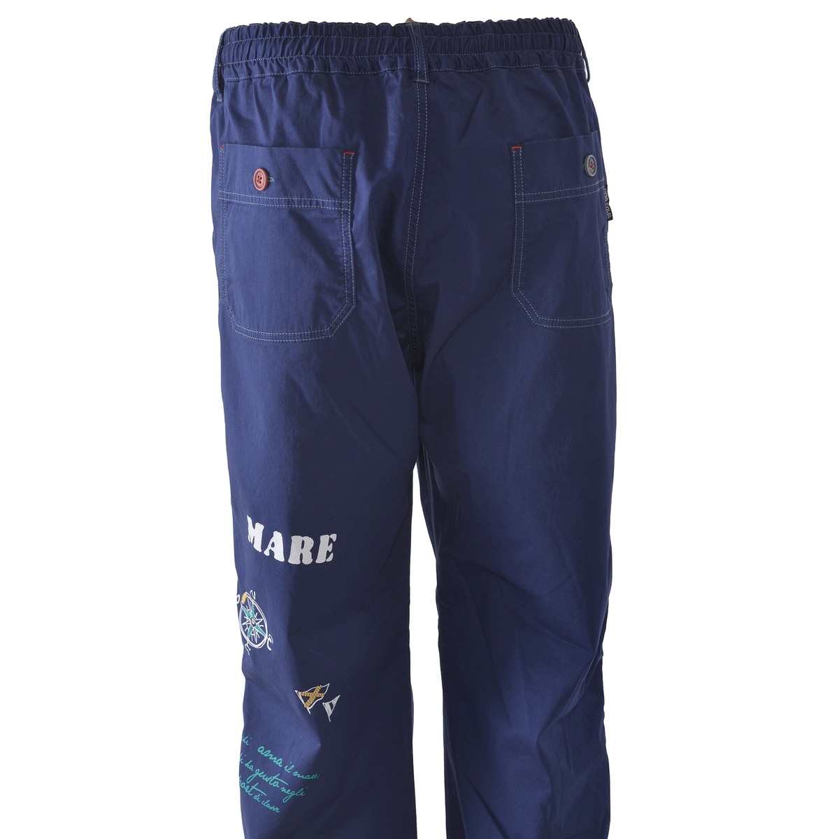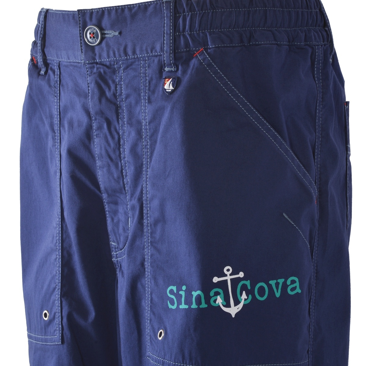 フロント右ポケットに「SINACOVA」文字とイカリをプリントと左バックに羅針盤や文字をプリントと刺繍でデザインしたマリンパンツです。