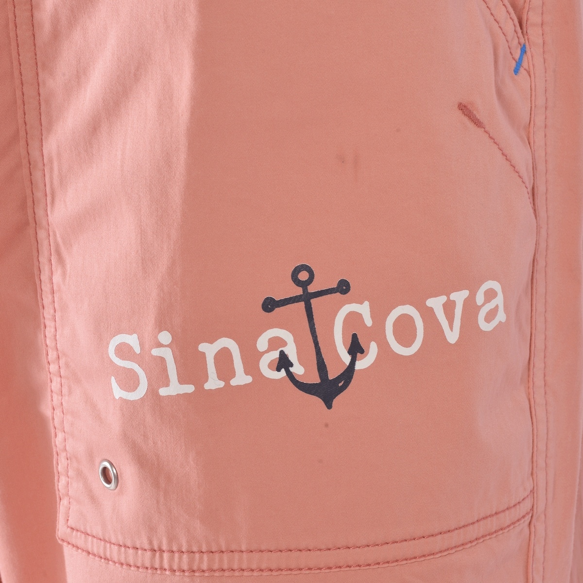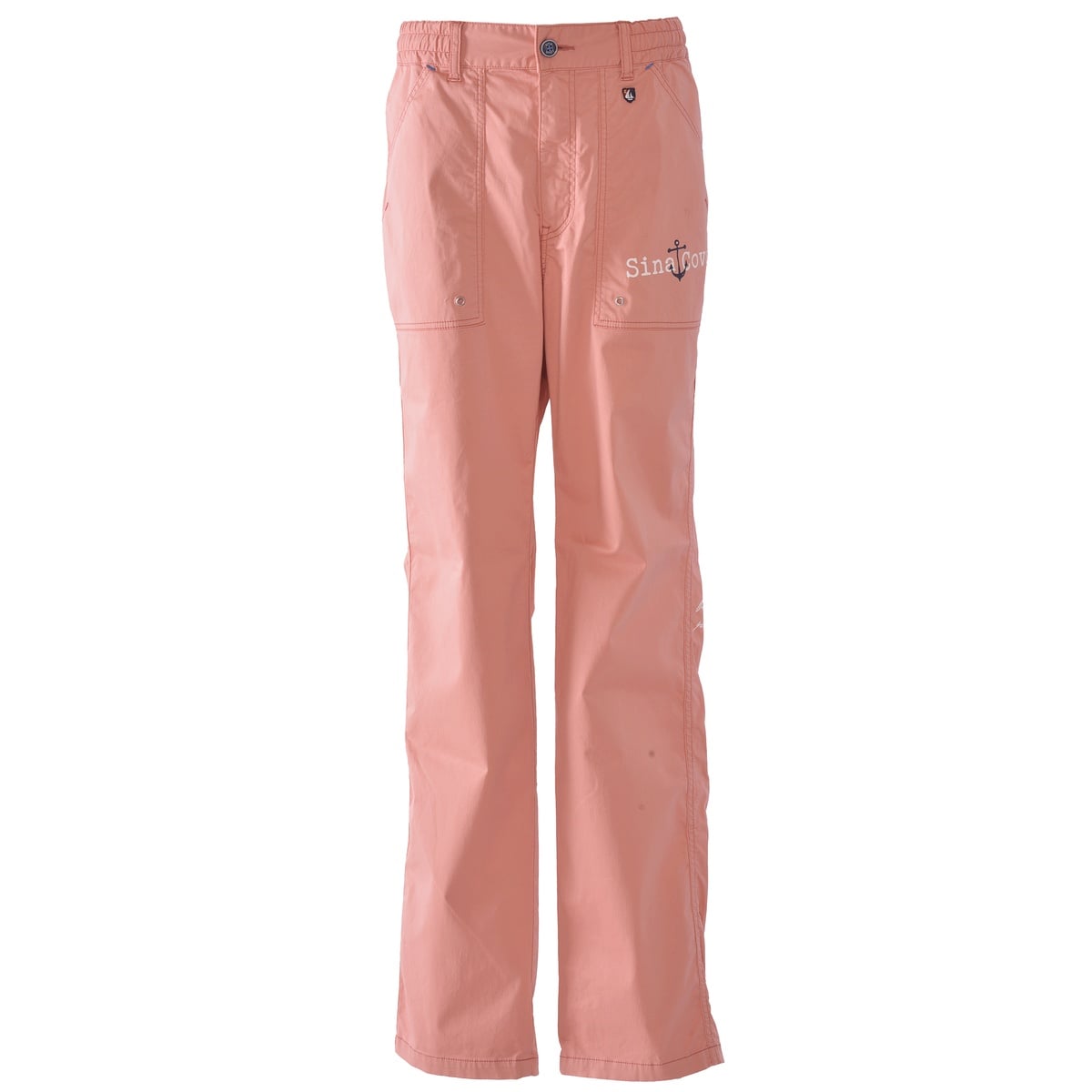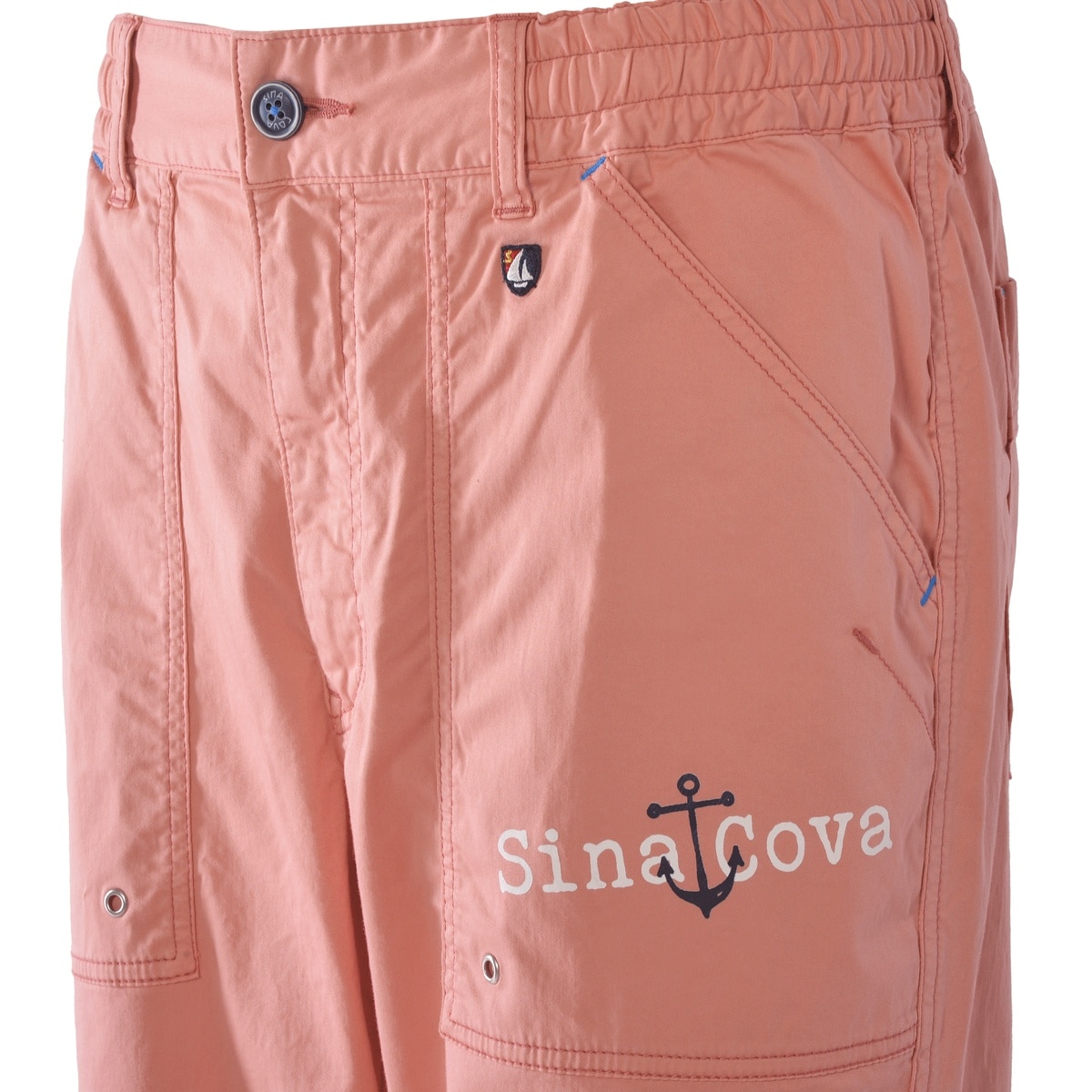 フロント右ポケットに「SINACOVA」文字とイカリをプリントと左バックに羅針盤や文字をプリントと刺繍でデザインしたマリンパンツです。