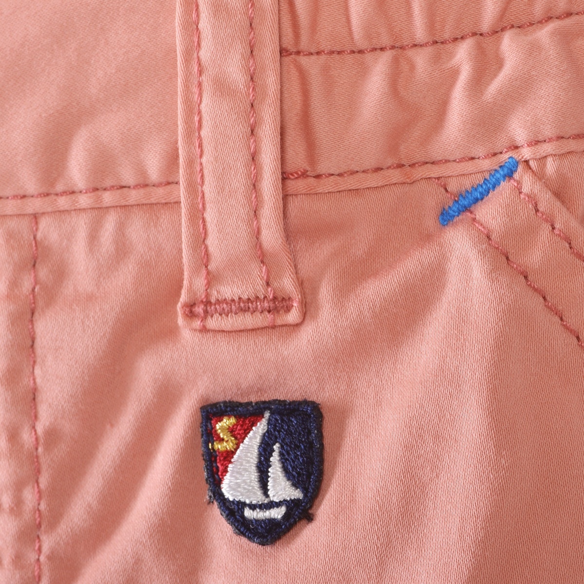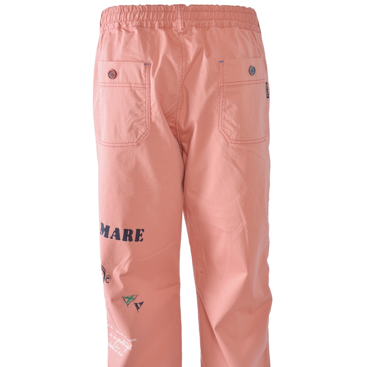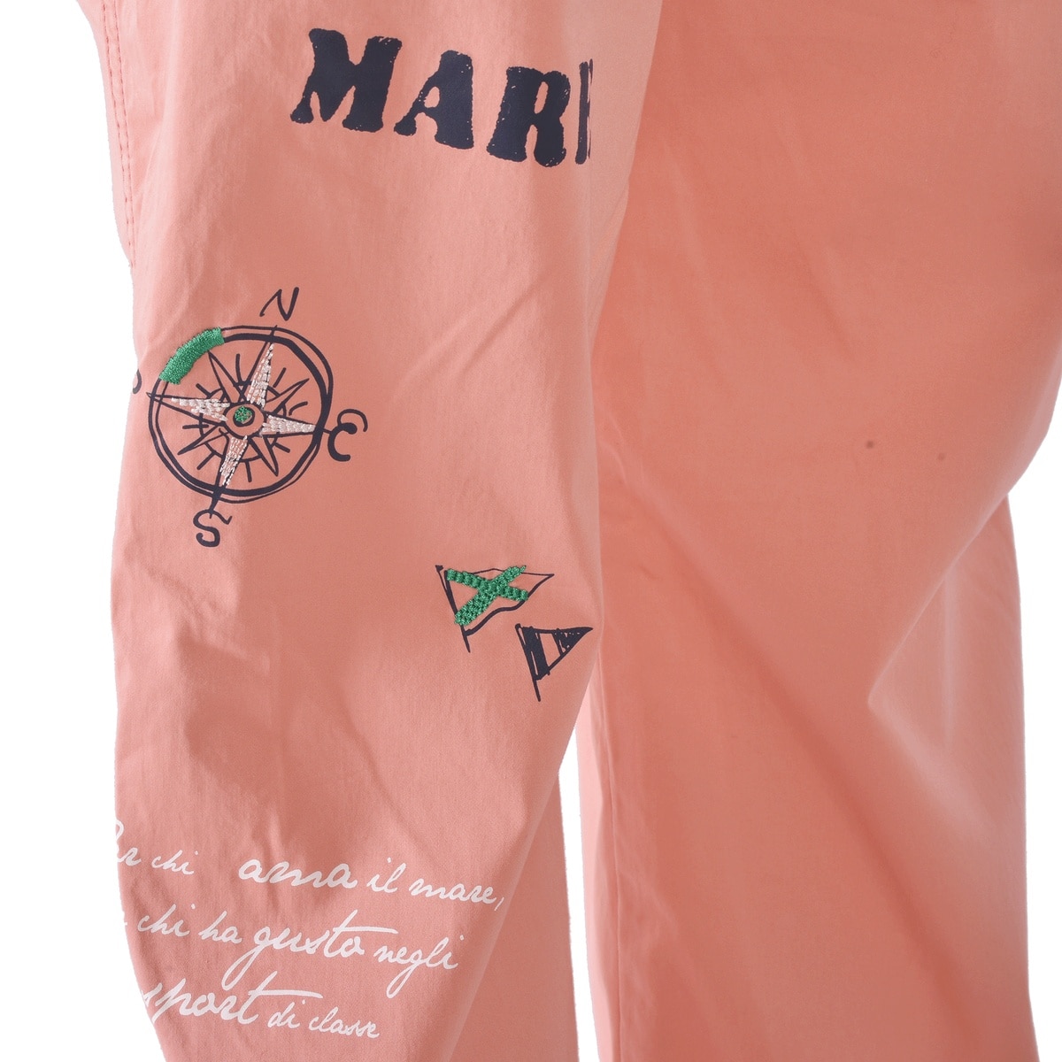 フロント右ポケットに「SINACOVA」文字とイカリをプリントと左バックに羅針盤や文字をプリントと刺繍でデザインしたマリンパンツです。
