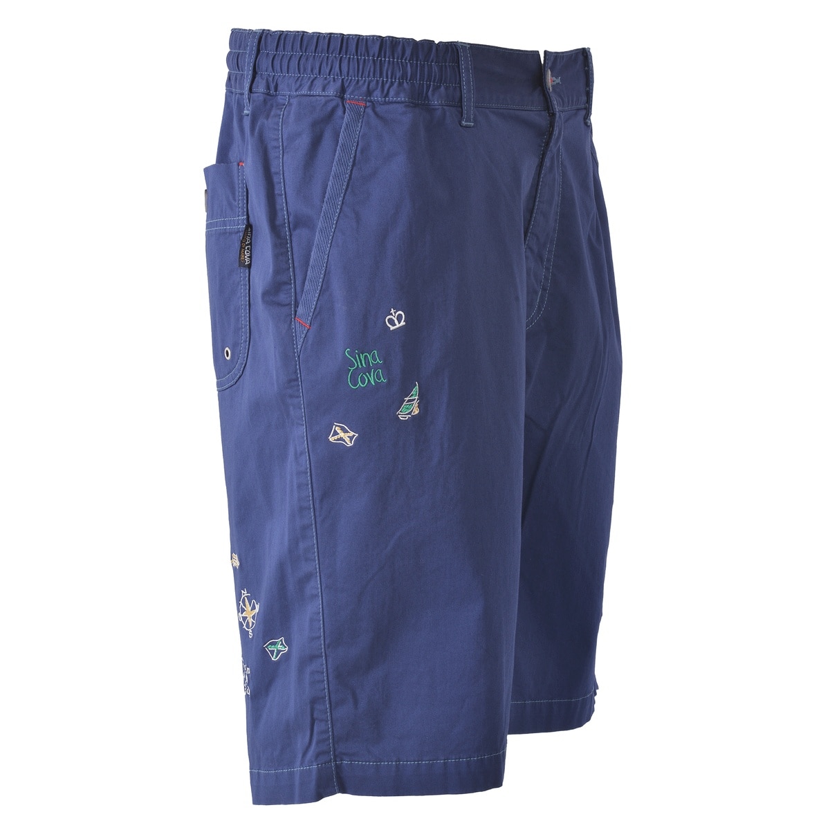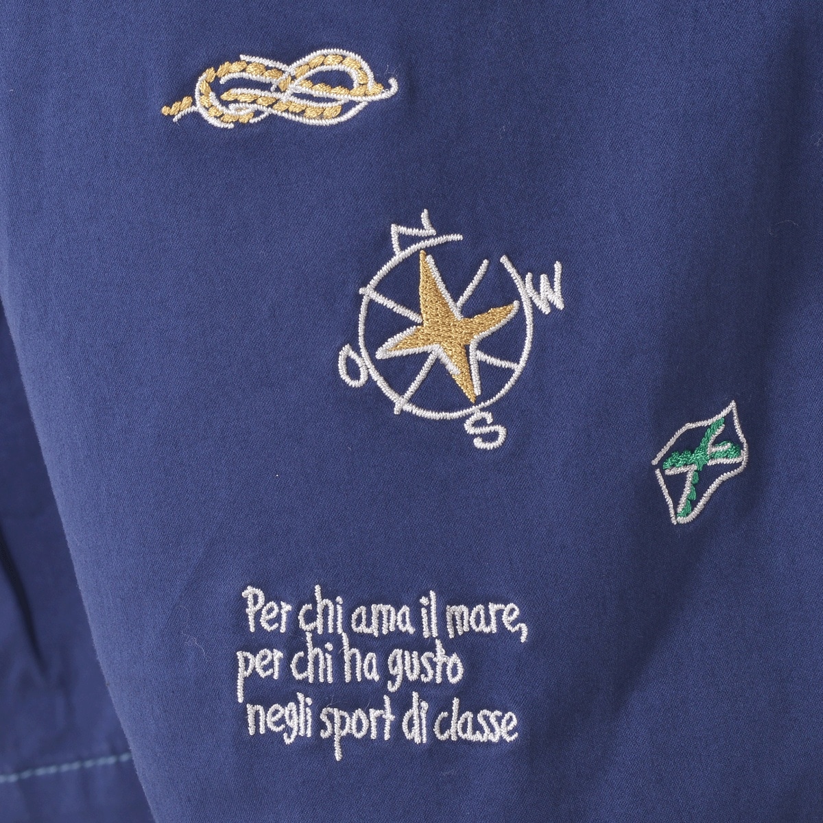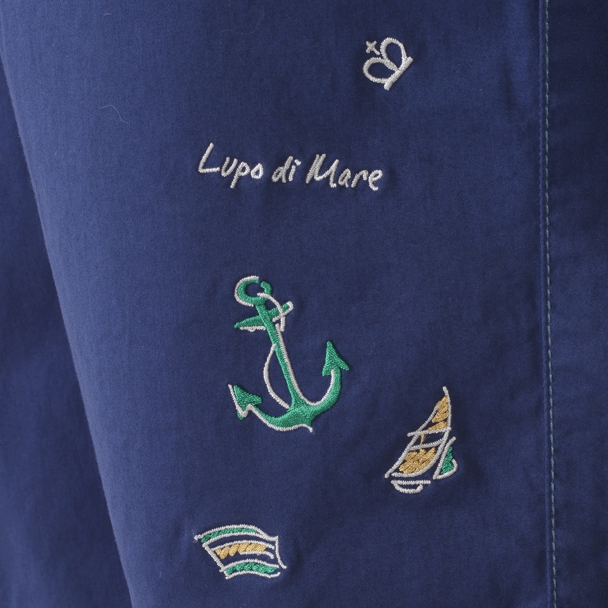 シナコバマリンモチーフを刺繍やプリントで各所にデザインしたショートパンツです。オリジナルのボタンやステッチワークにもこだわりシナコバらしいマリンショートパンチに仕上げました。生地にはサテン組織で織り上げやや光沢感がありソフトでストレッチ性も高い素材を使用しています。・ウエストコード付き・ウエストシャーリング・ひざ丈・その他(K)サイズ有り経糸に60番手の細番手を使用し緯糸に40番手のストレッチ性のある糸を打ち込んで、サテン組織で織り上げ、光沢感があり、柔らかく、軽くて伸びのある素材を使用しました。ウエストシャーリングで、3か所に王冠、ロゴ、イカリなどをラフな感じで刺繍を施し、総柄とはまた違う遊び心を入れたショートパンツにしました。同系色の配色と太番手のステッチワーク、カンドメ配色が魅力の商品です。【SINA COVA 2025 Spring & Summer Style Book】掲載商品