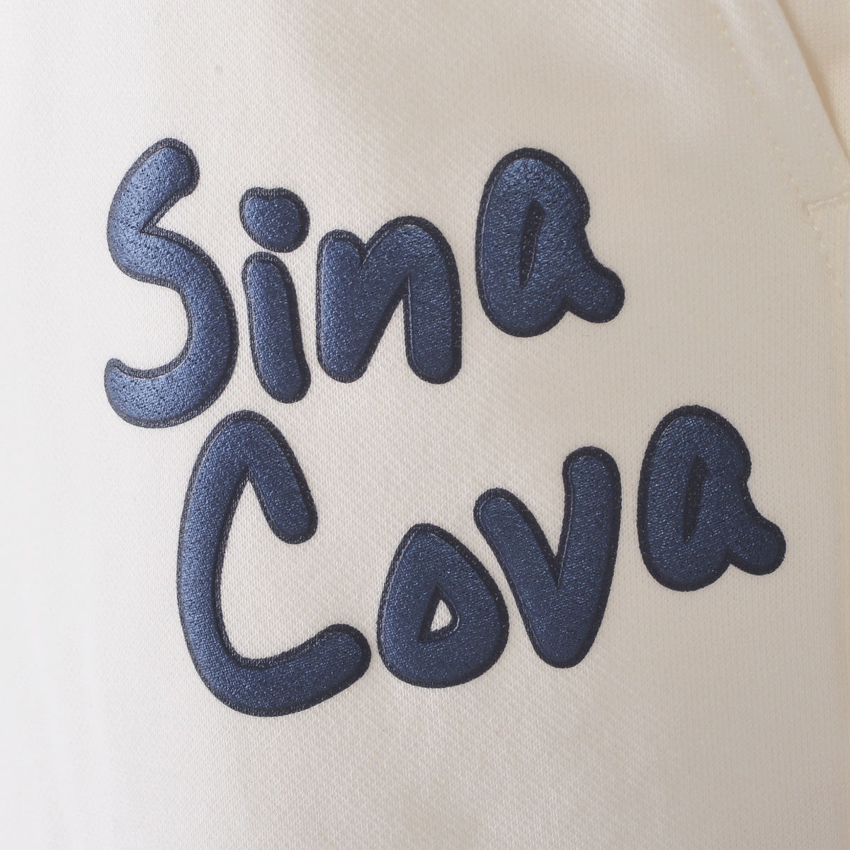「SINA COVA」文字を高級感のあるパール発泡プリントでデザインしたスウェットパンツです。